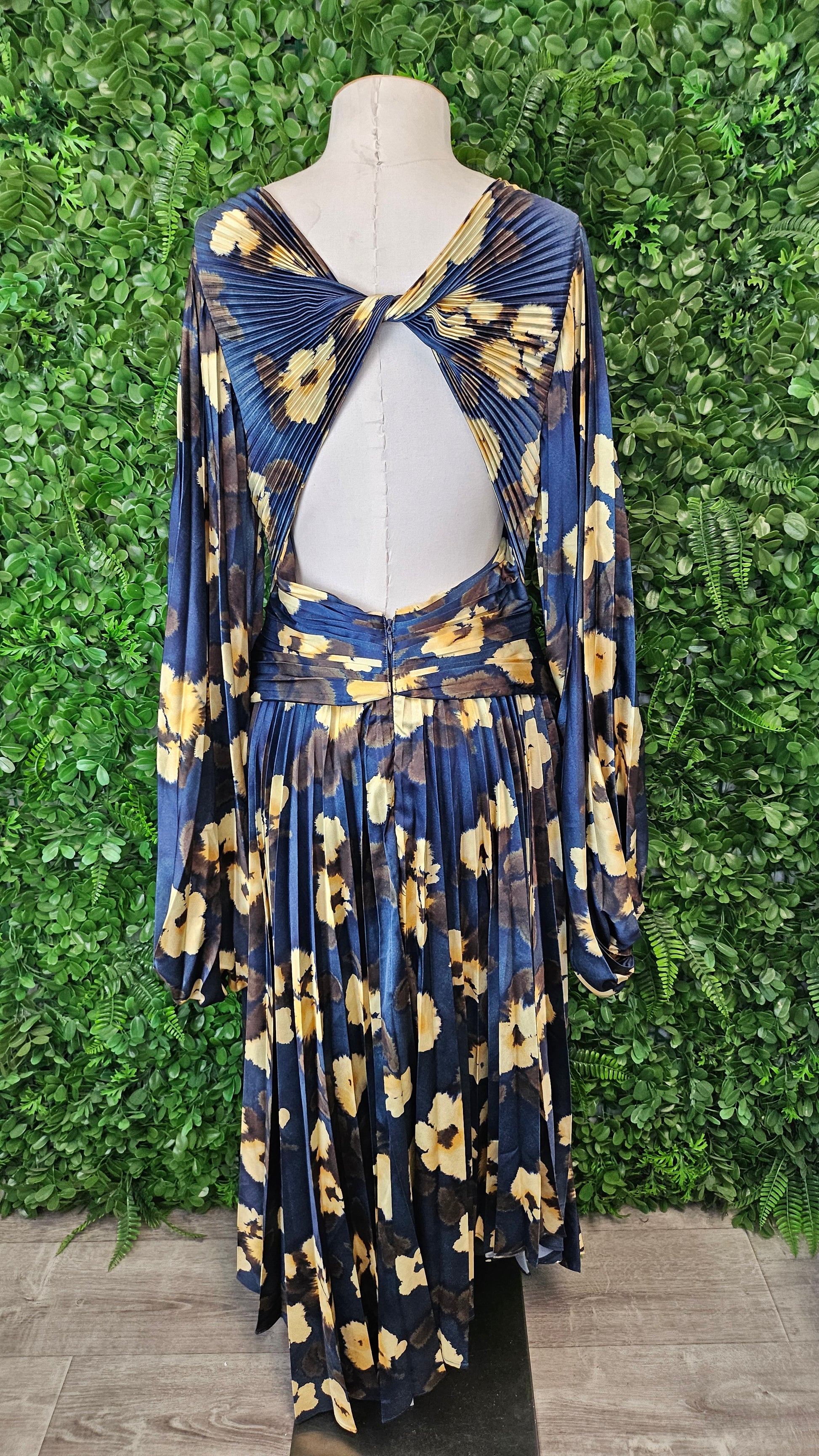 Crafted from a luxurious soft touch fabric with pleating, accentuated sleeves, plunging neckline and asymmetrical hemline. Gorgeous, dreamy dress in a navy base with lemon accents. Flattering and elegant silhouette. Perfect for weddings, race days, vineyard lunches, cocktail parties. As new