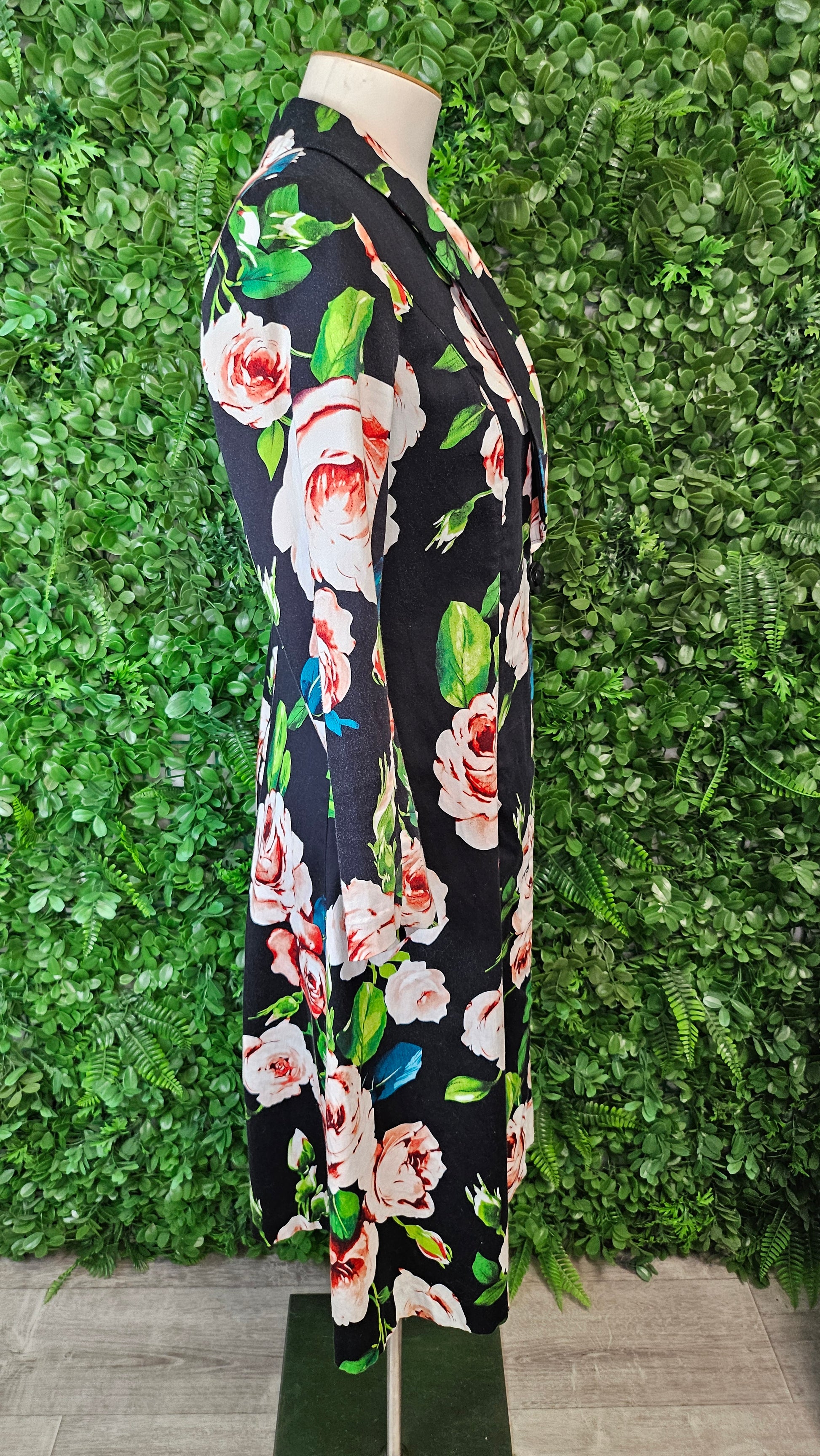 Fit & Flare duster coat, rounded lapel with 1 button closure, lovely statement coat in a lovely bold floral print.