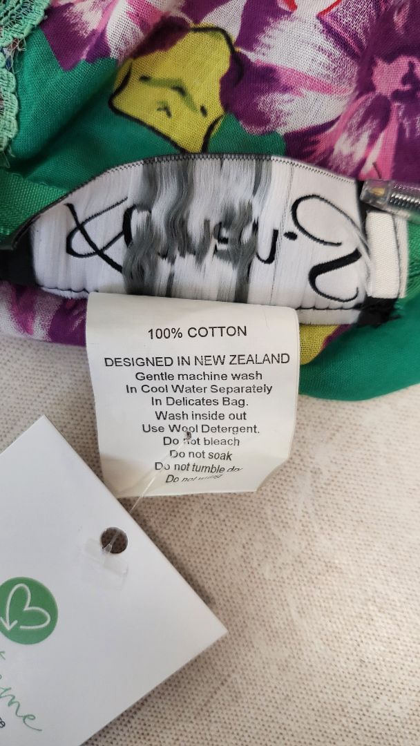 Gorgeous dress with wide shoulder straps. Green with flower and butterfly print front and back and piping detail. 100% cotton.