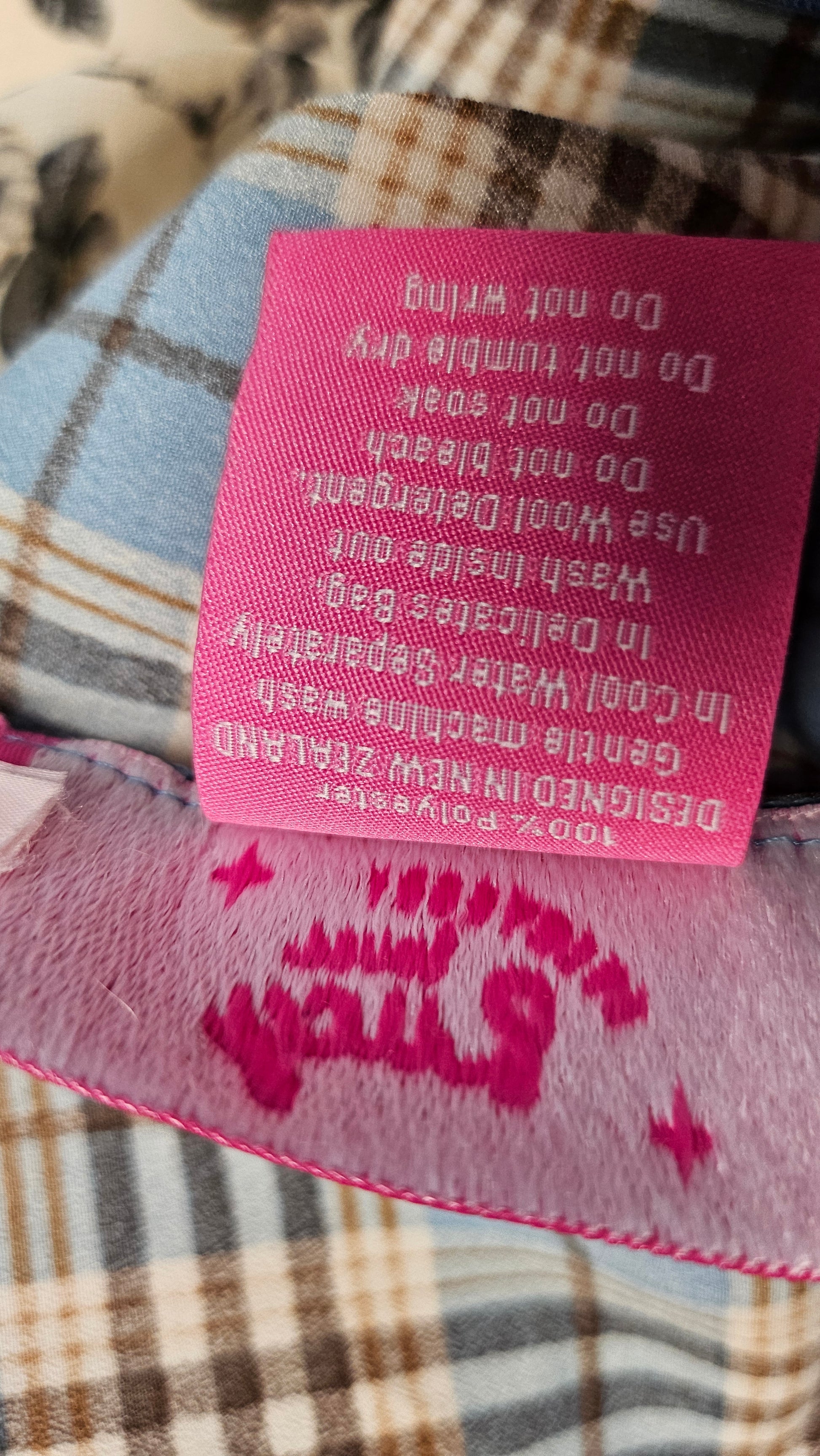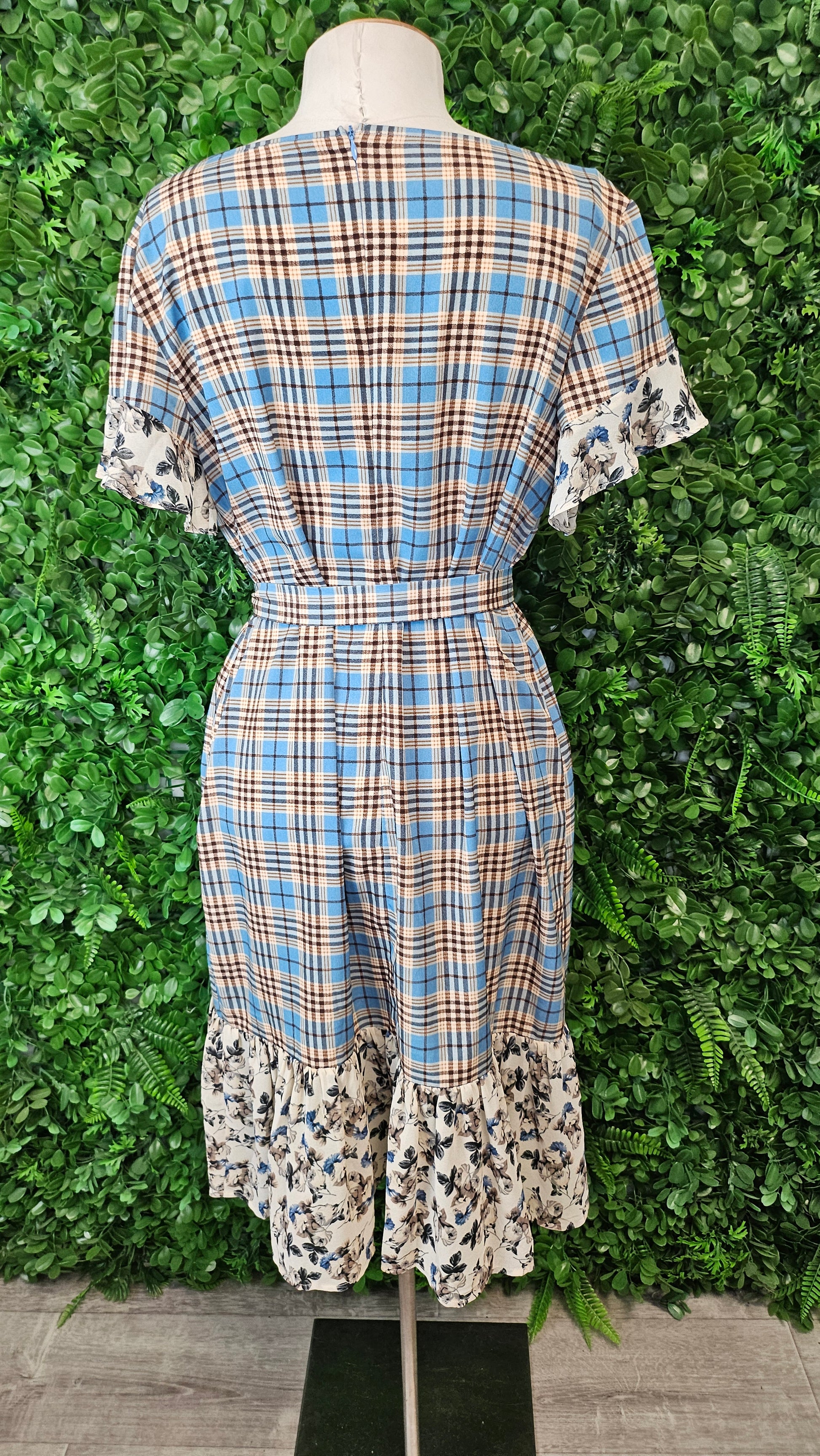 50's inspired dress from the Everybody Loves Lucy range. Contrast floral and check print in tones of blue and brown. Optional self fabric belt. Zip at back.