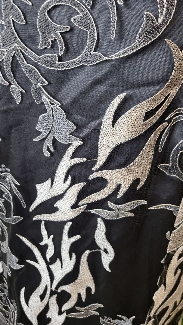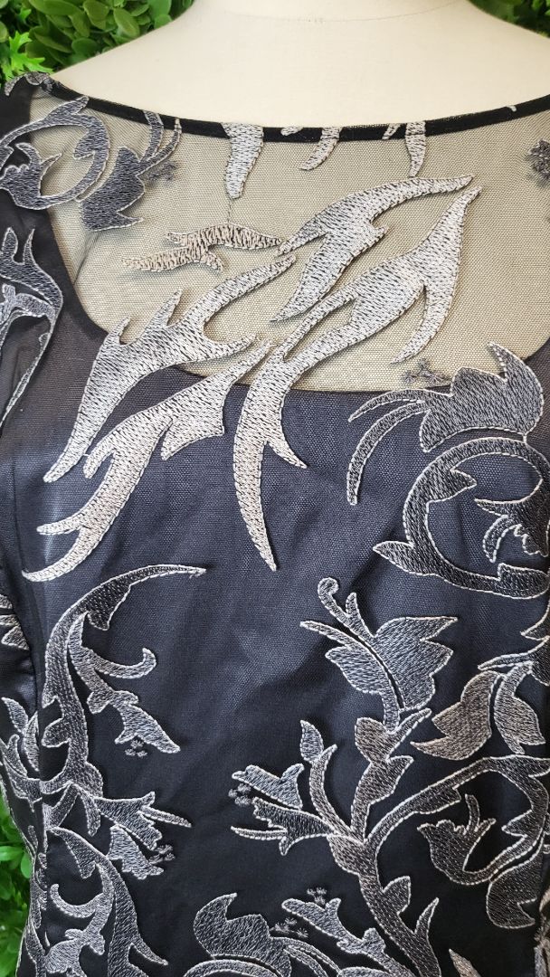 Floral A-line style dress crafted from embroidered mesh fabric and satin underdress. Sheer round neckline with a v at the back. The tulle hem adds a touch of romance. The perfect ocassion dress.