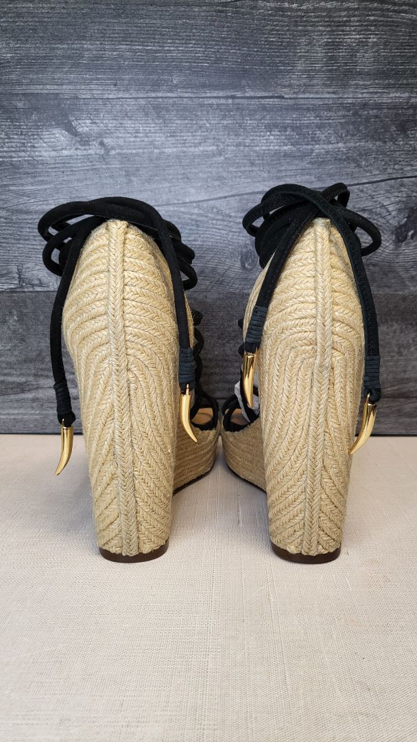 Black leather strappy heel with jute woven platform sole and around back of heel.