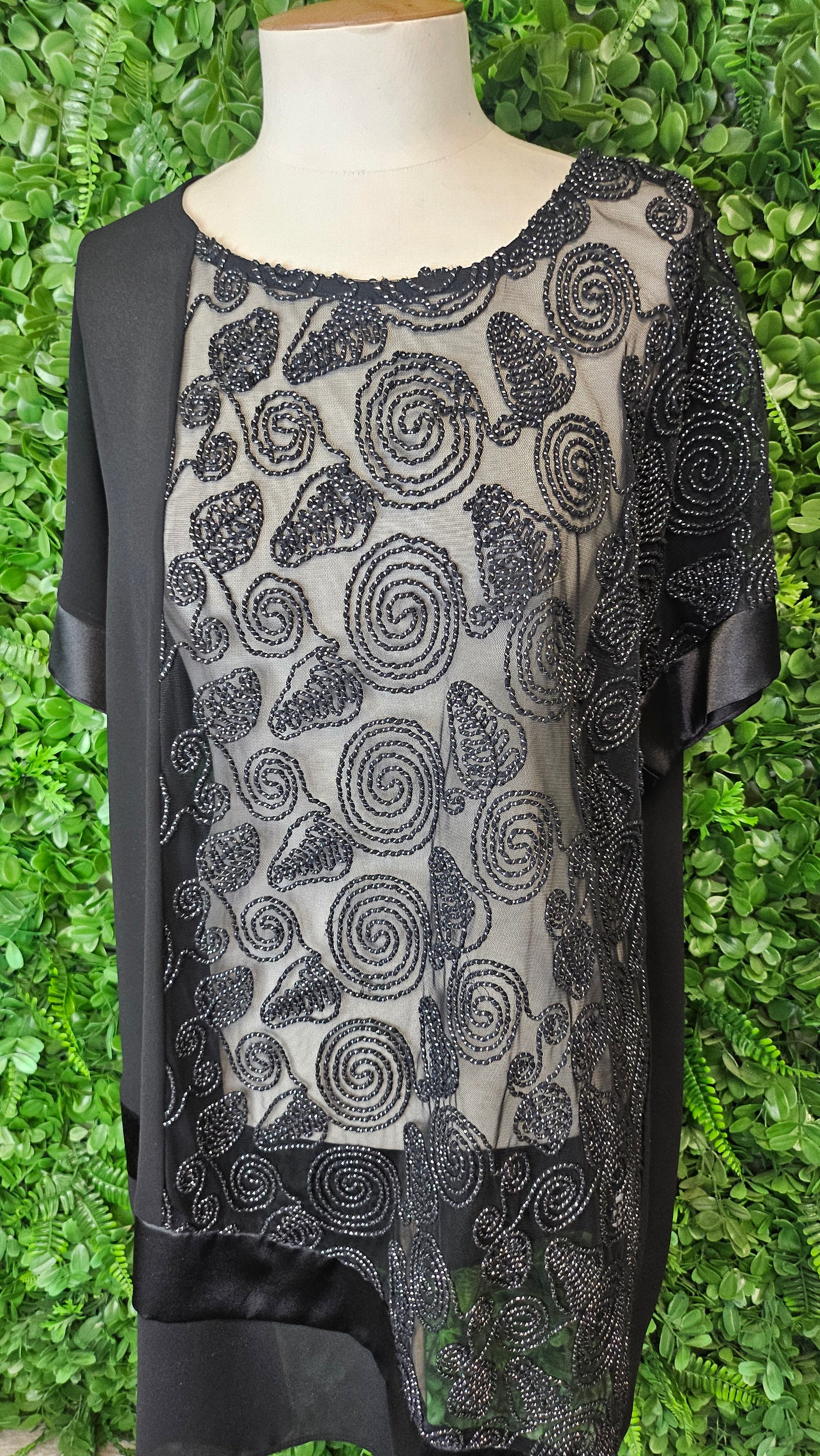 Georgette top with metallic rope squiggle panel and satin trim on cuff and hem