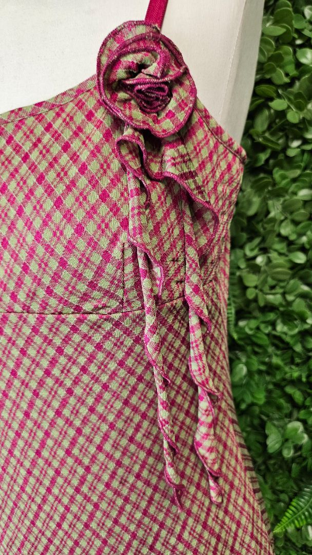 Stretch fit pencil dress with shaped bust and rosette feature off skinny straps that adjust.
