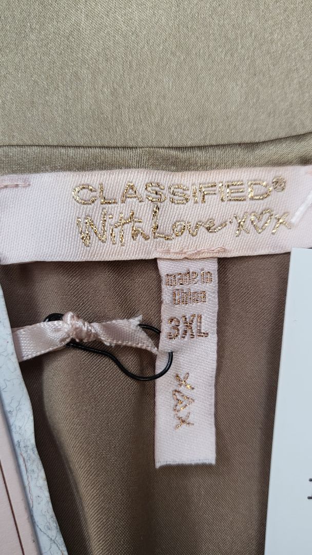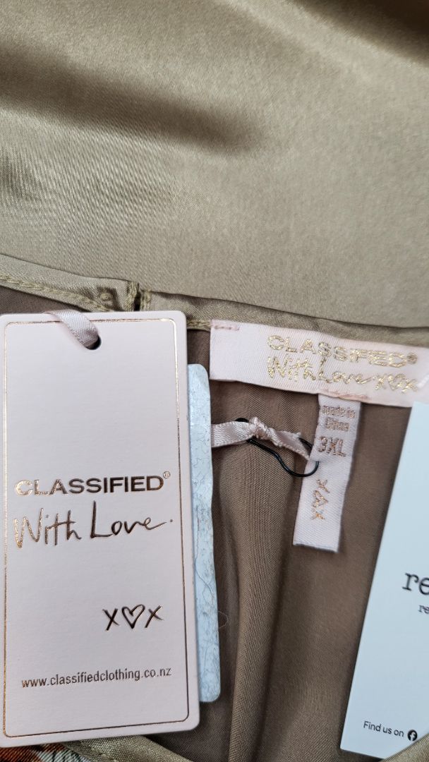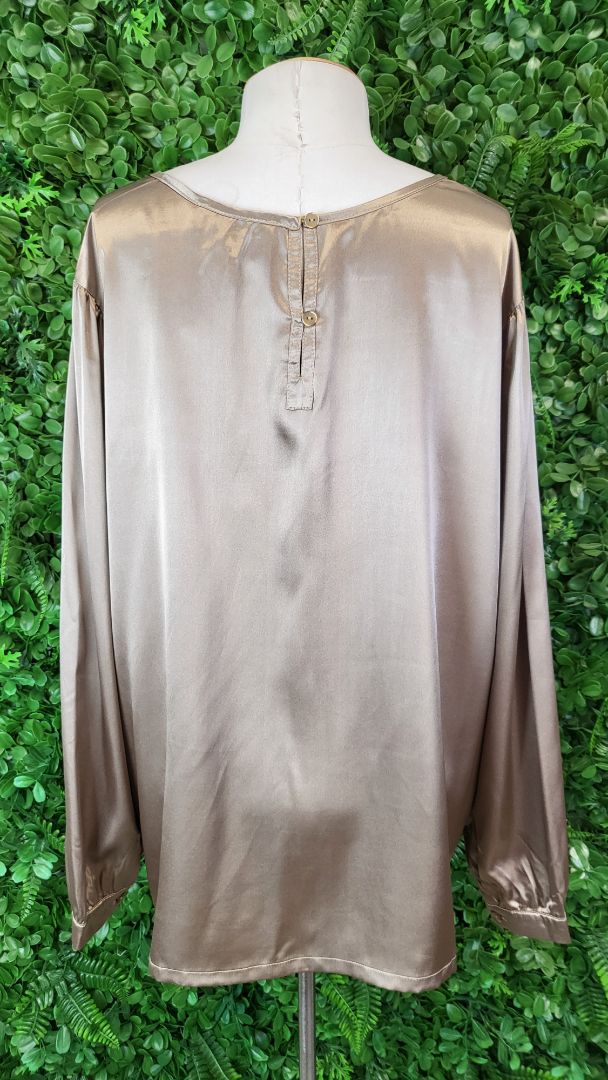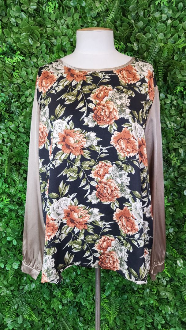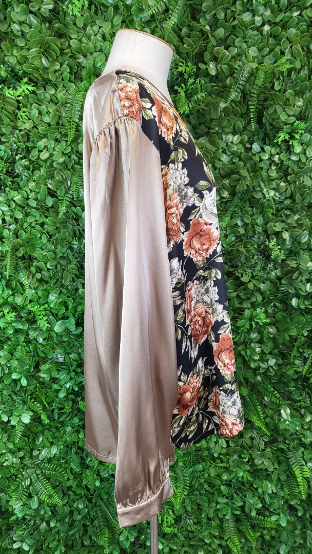Print front with sateen sleeves and back, scoop necKline and button up cuff.