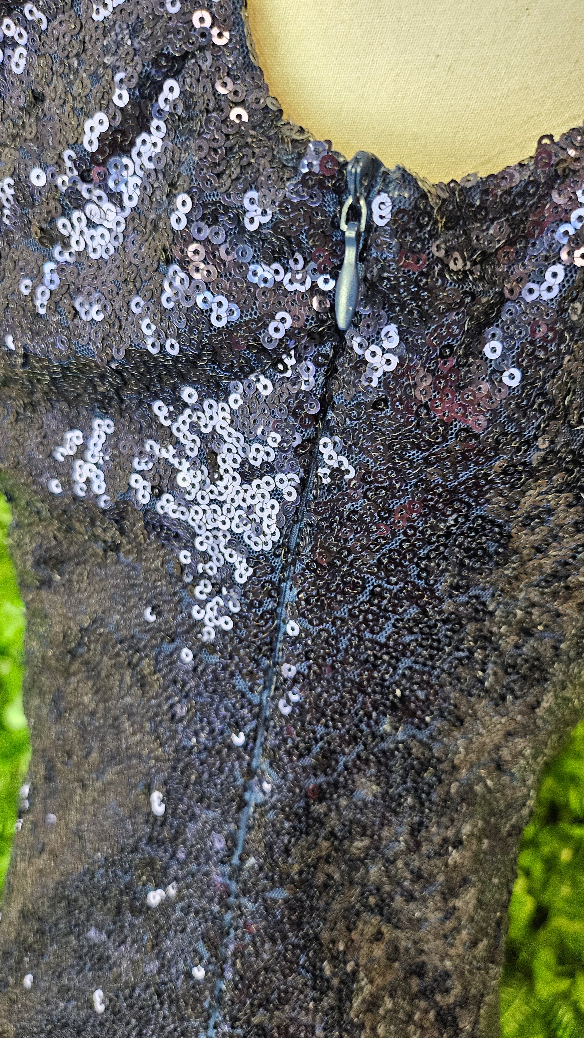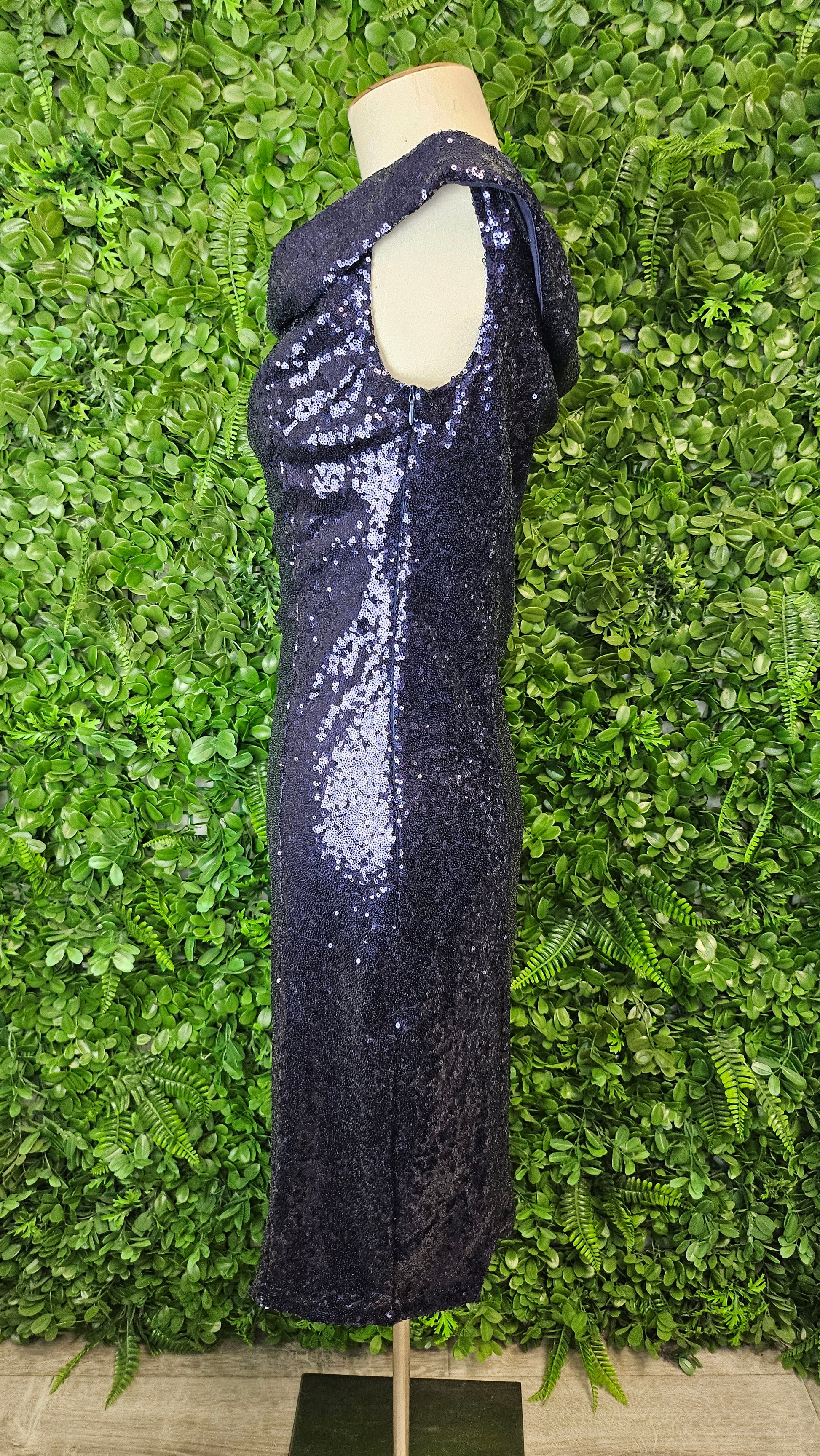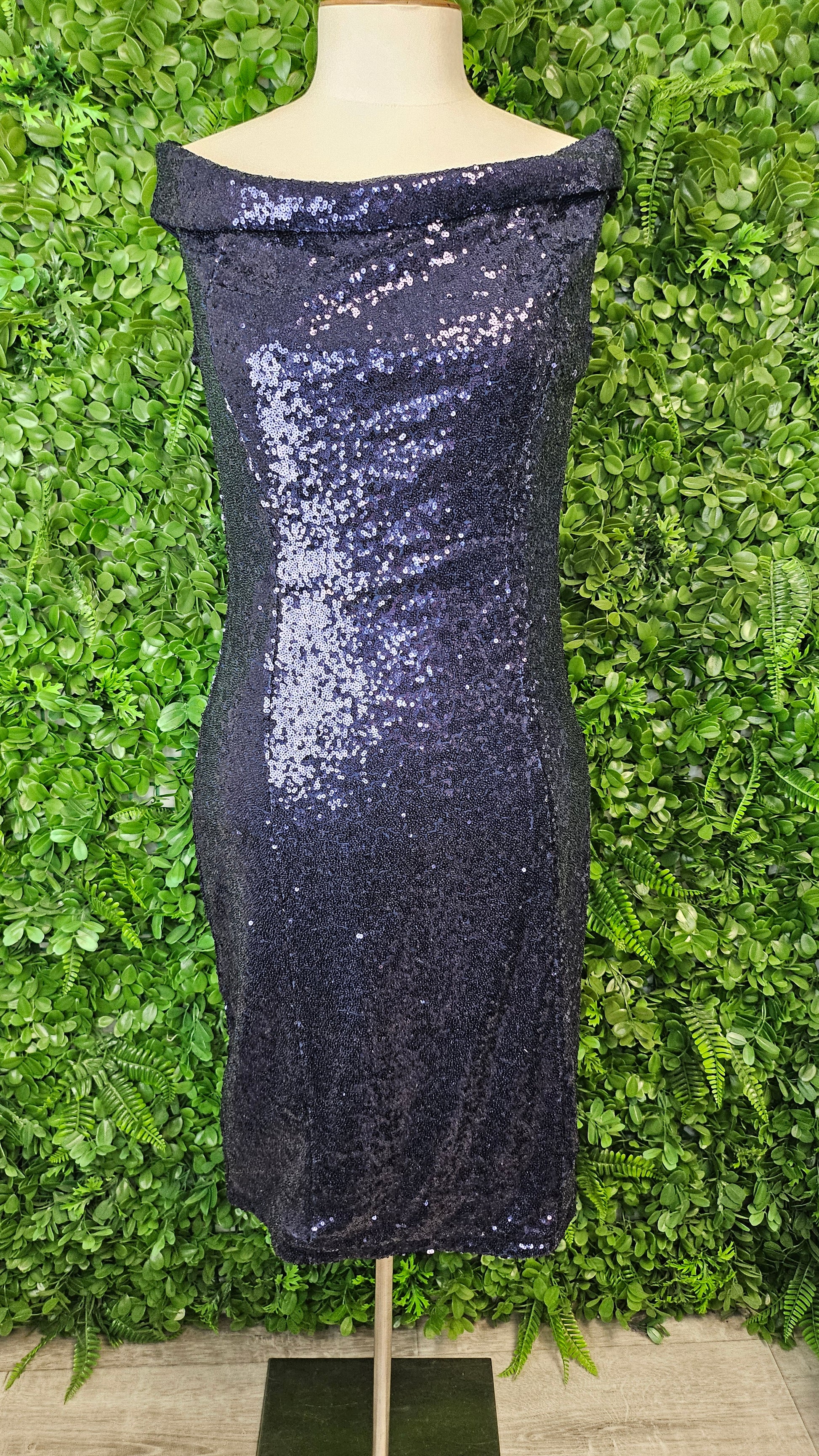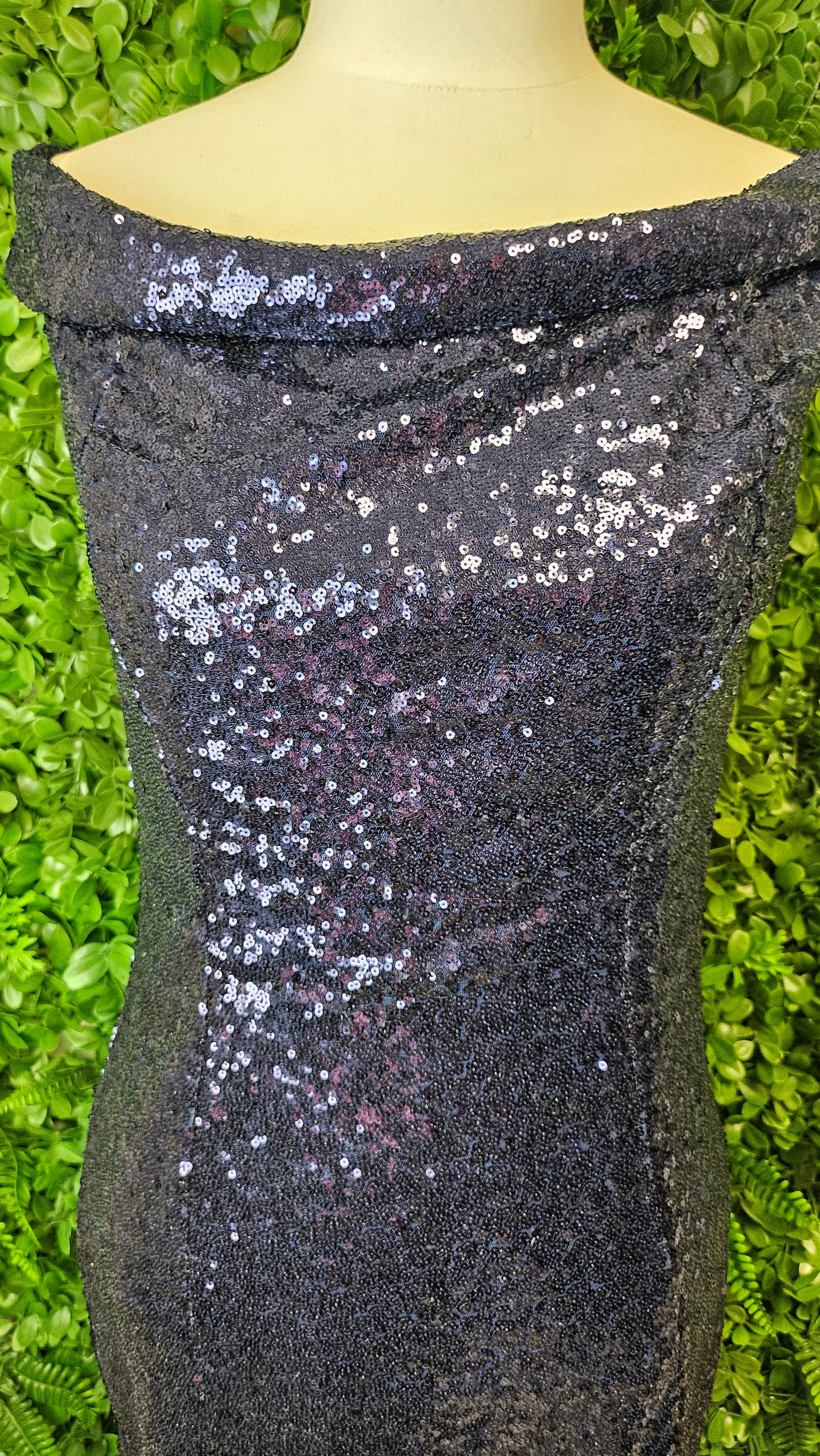 Stunning full sequin party dress with some stretch, off or on the shoulder folded neckline, side zip .