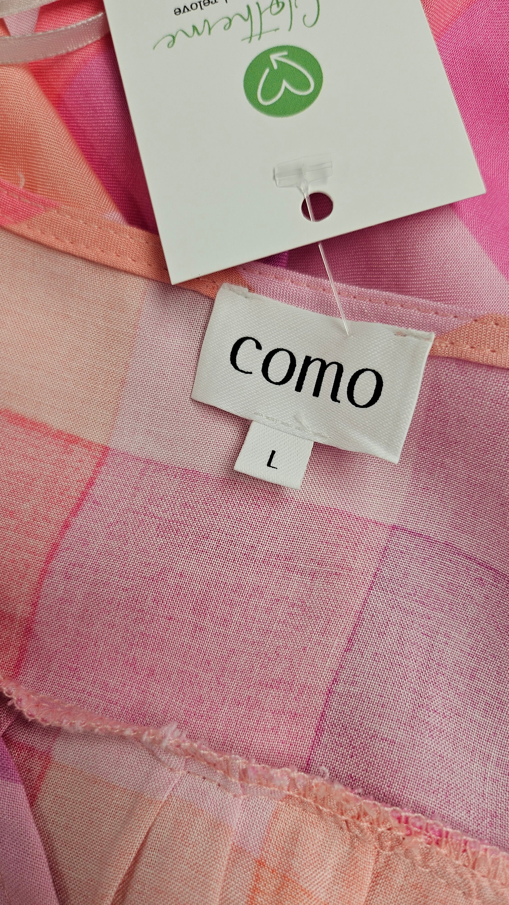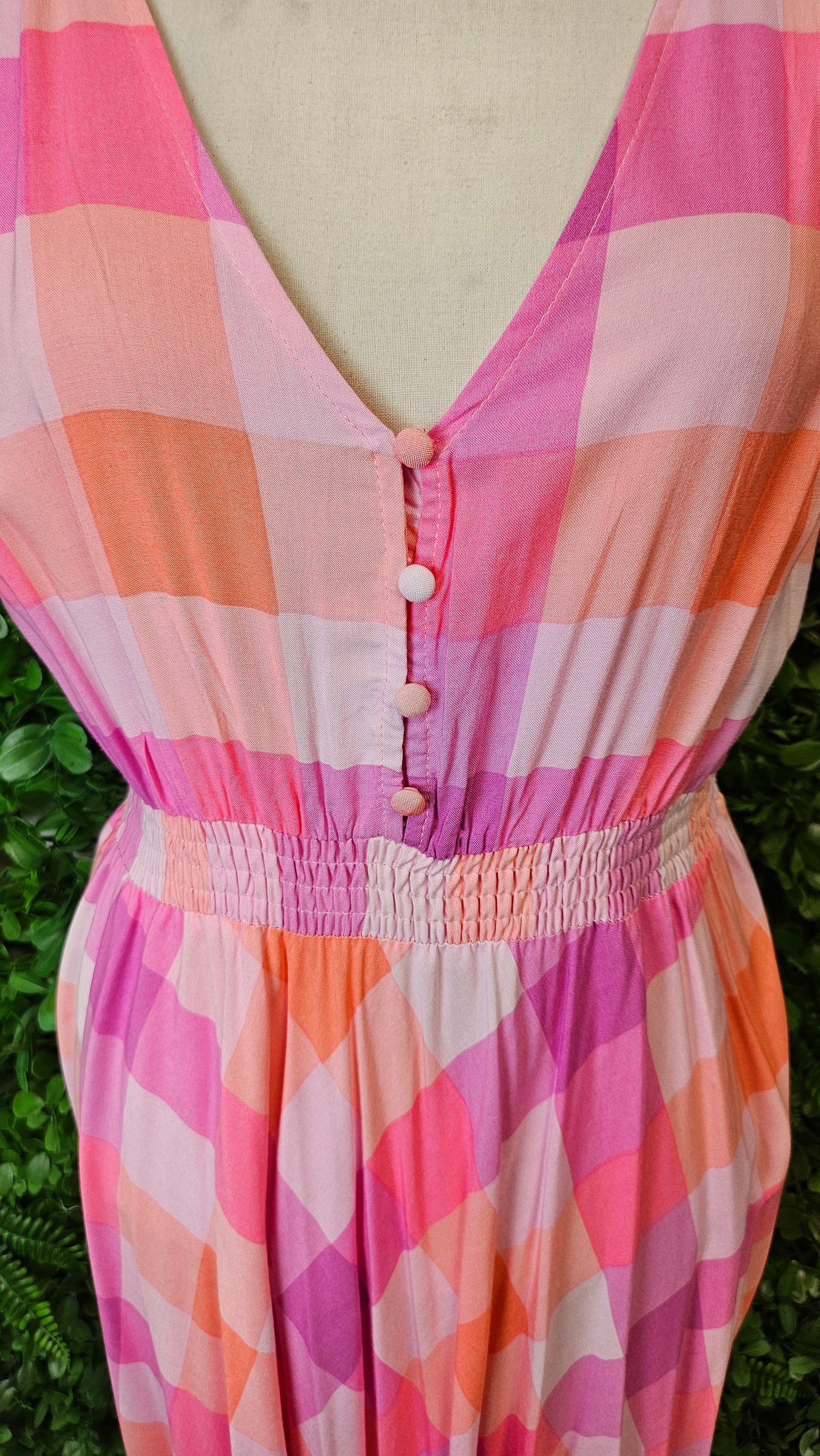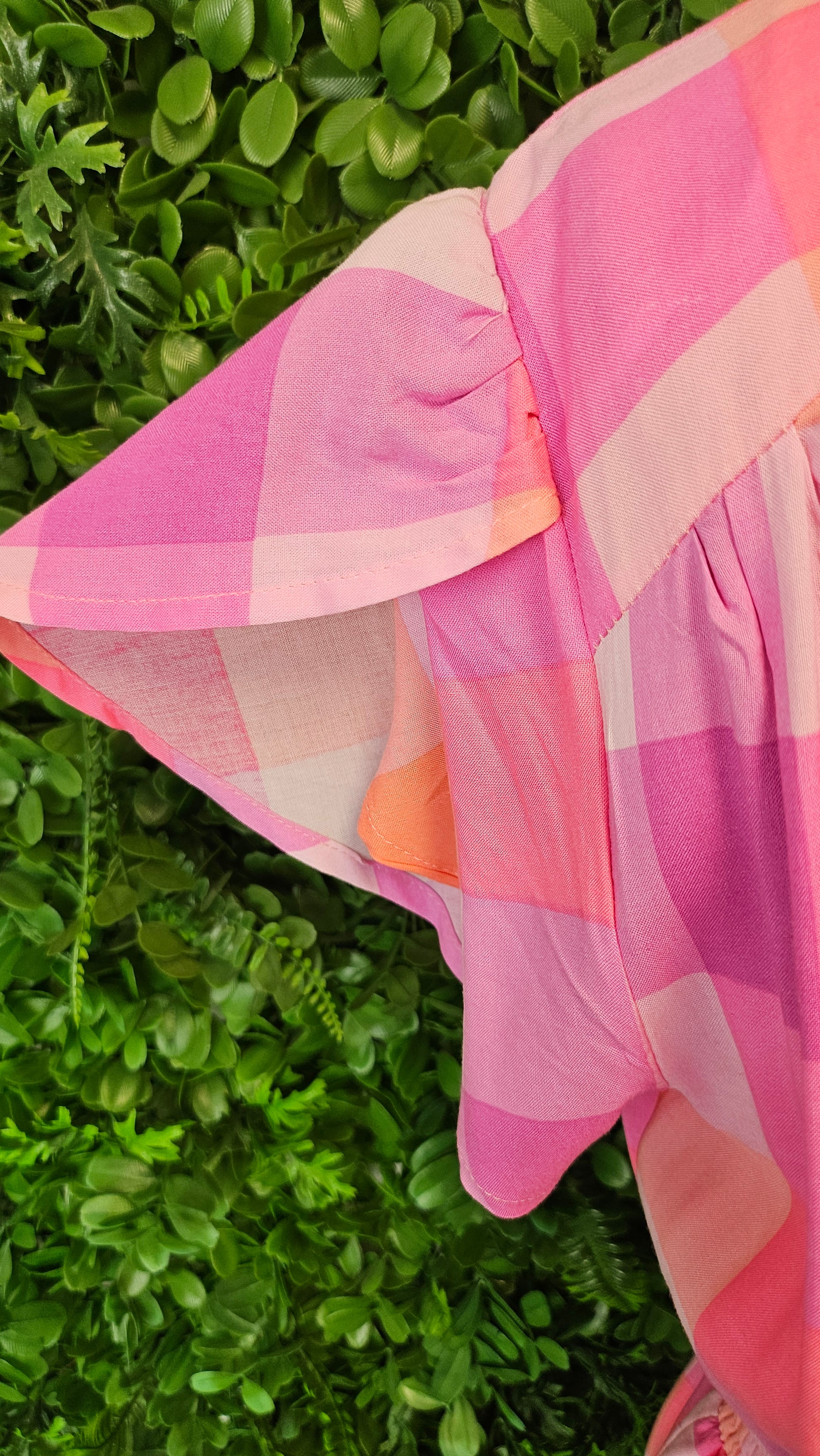 Pink and orange dress with folded flutter sleeve, shirred waist and v neckline.
