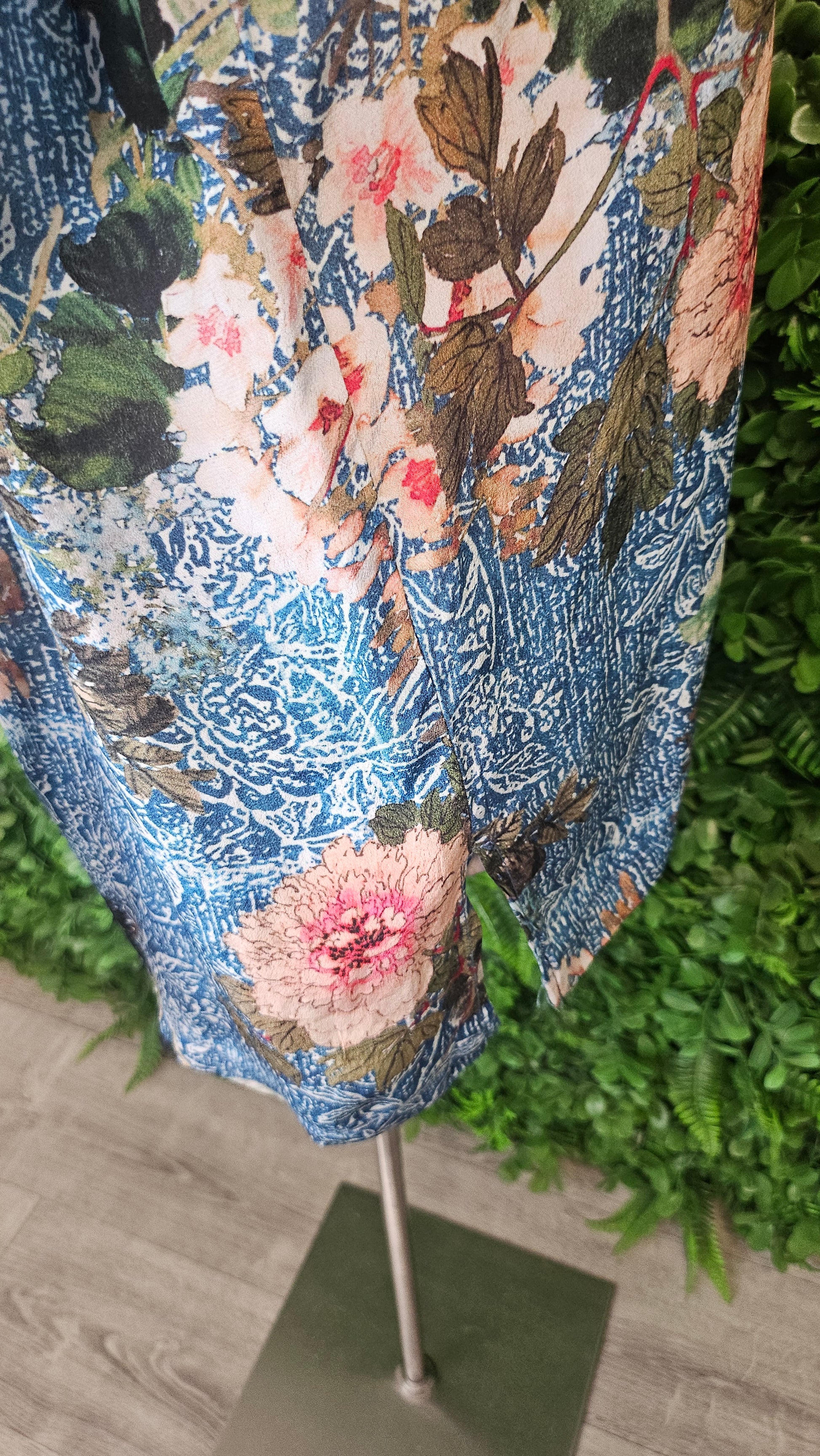 Designed in the green come true printed viscose fabric, high/low hemline, scoop neck top, long sleeves with a shirred cuffs with frill.