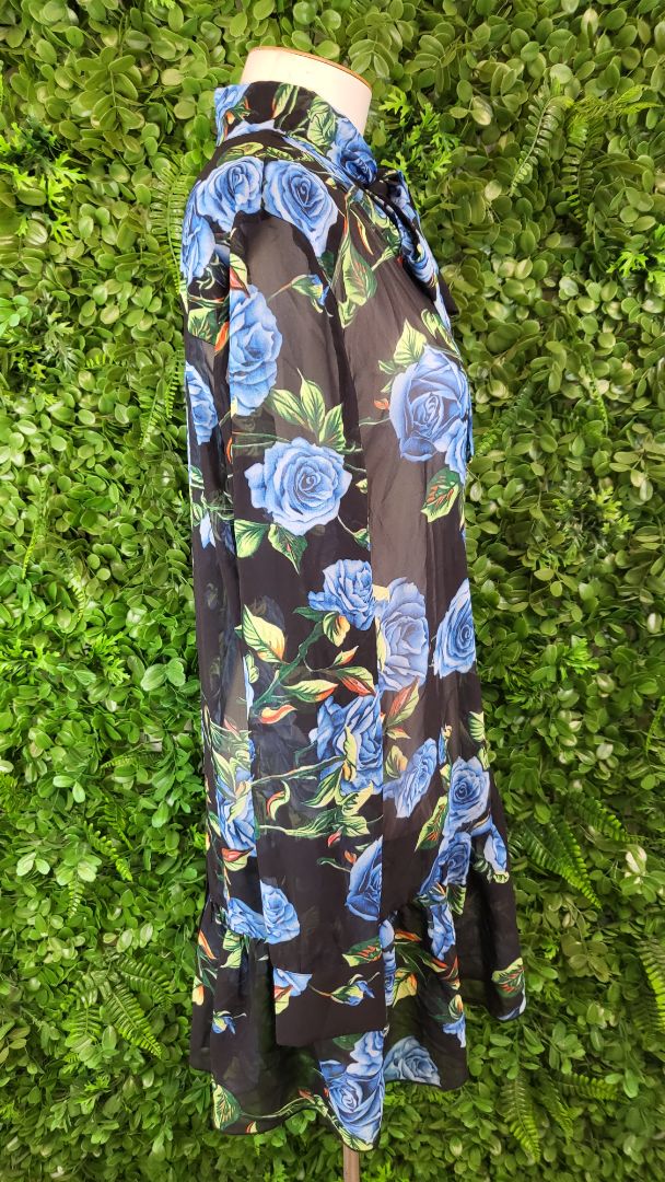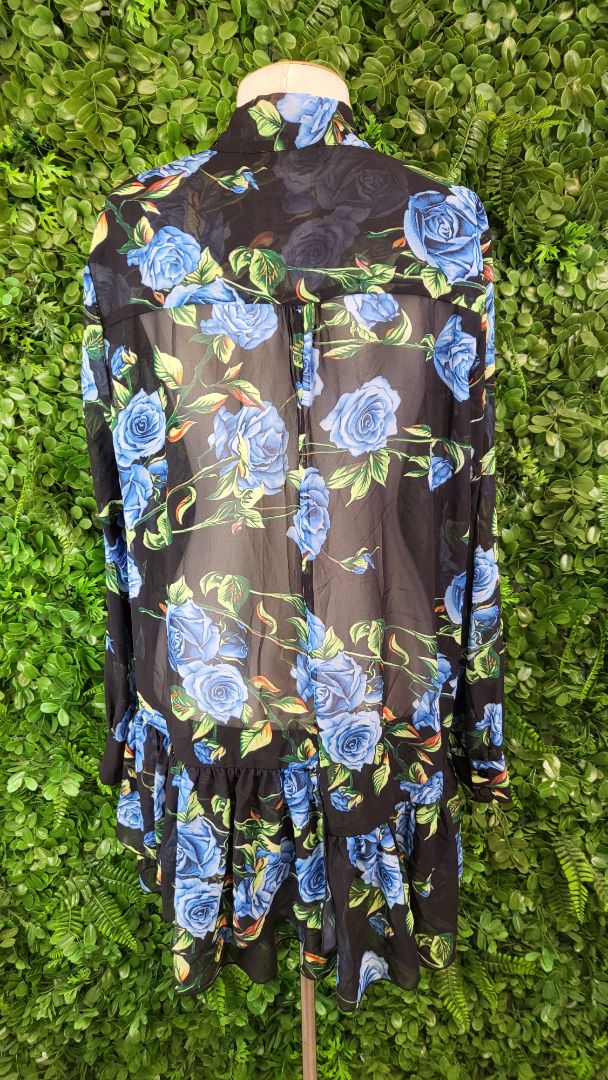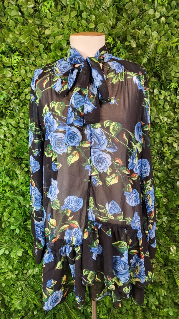 Longline shirt with overlayed hemline frill, v-neckline with pussycat bow, long sleeves with button up cuffs.