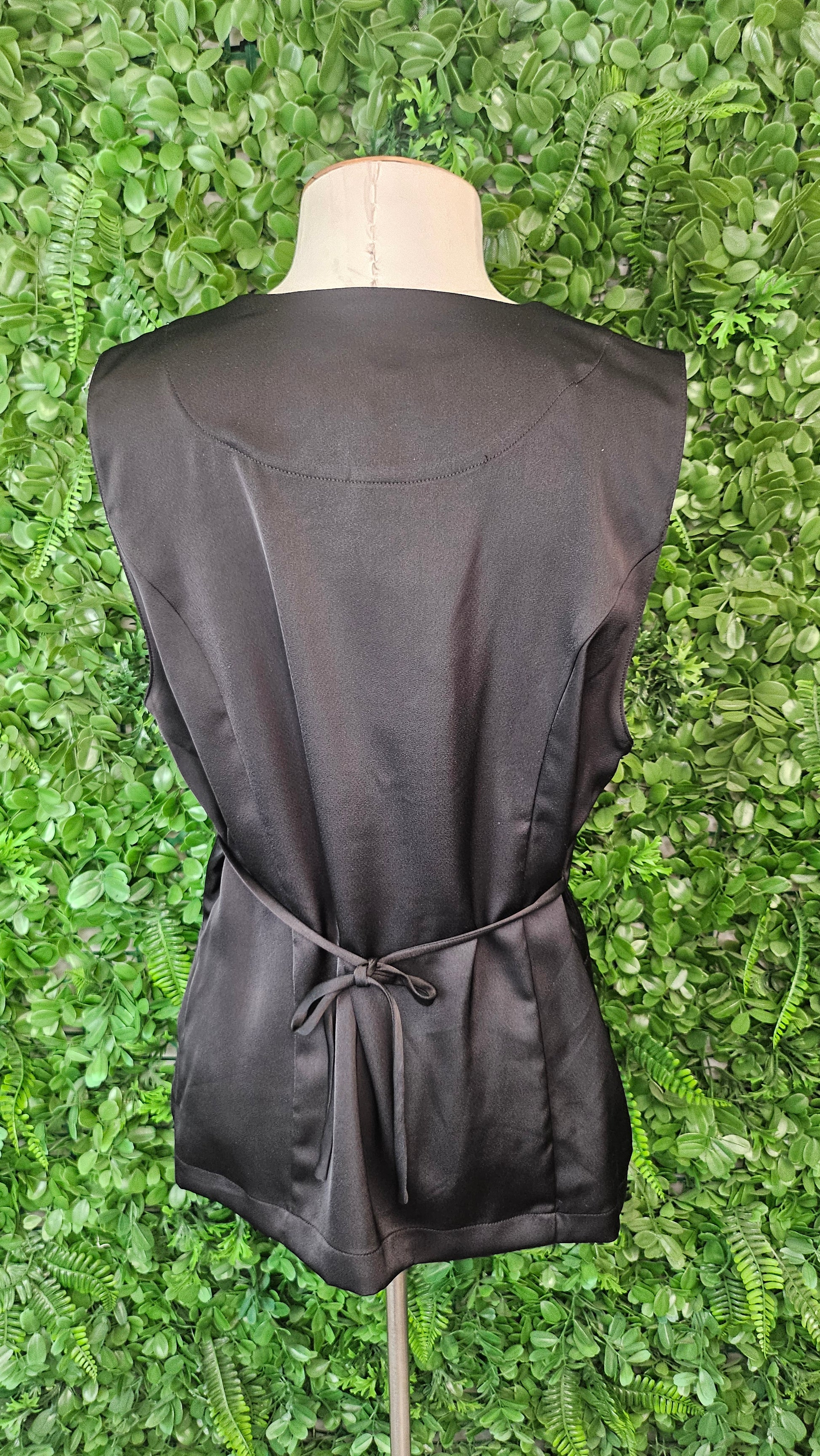 Button down vest style top in a sateen fabric with waist tie.