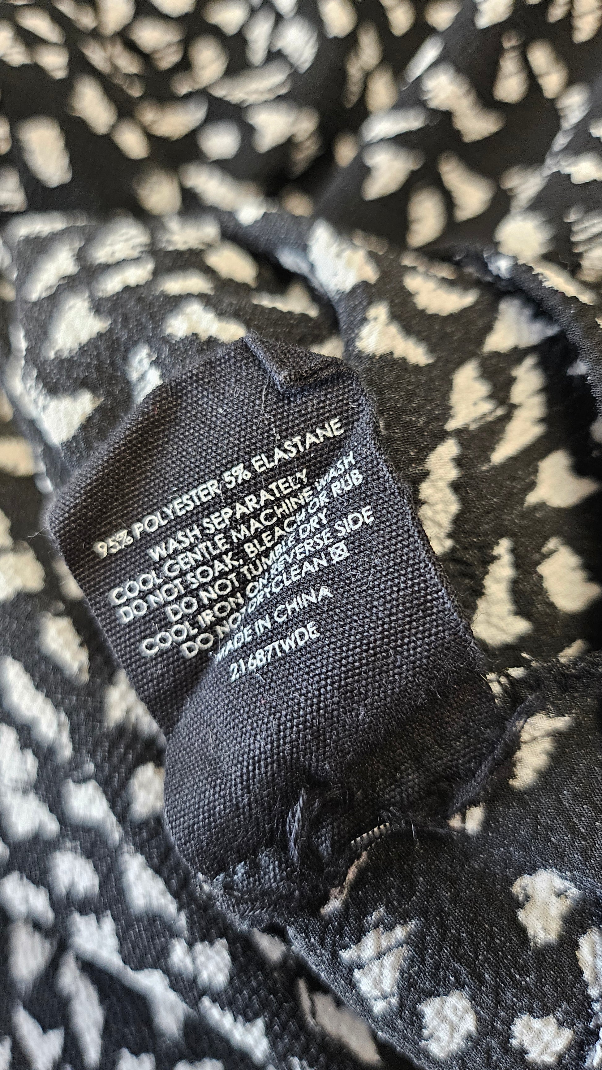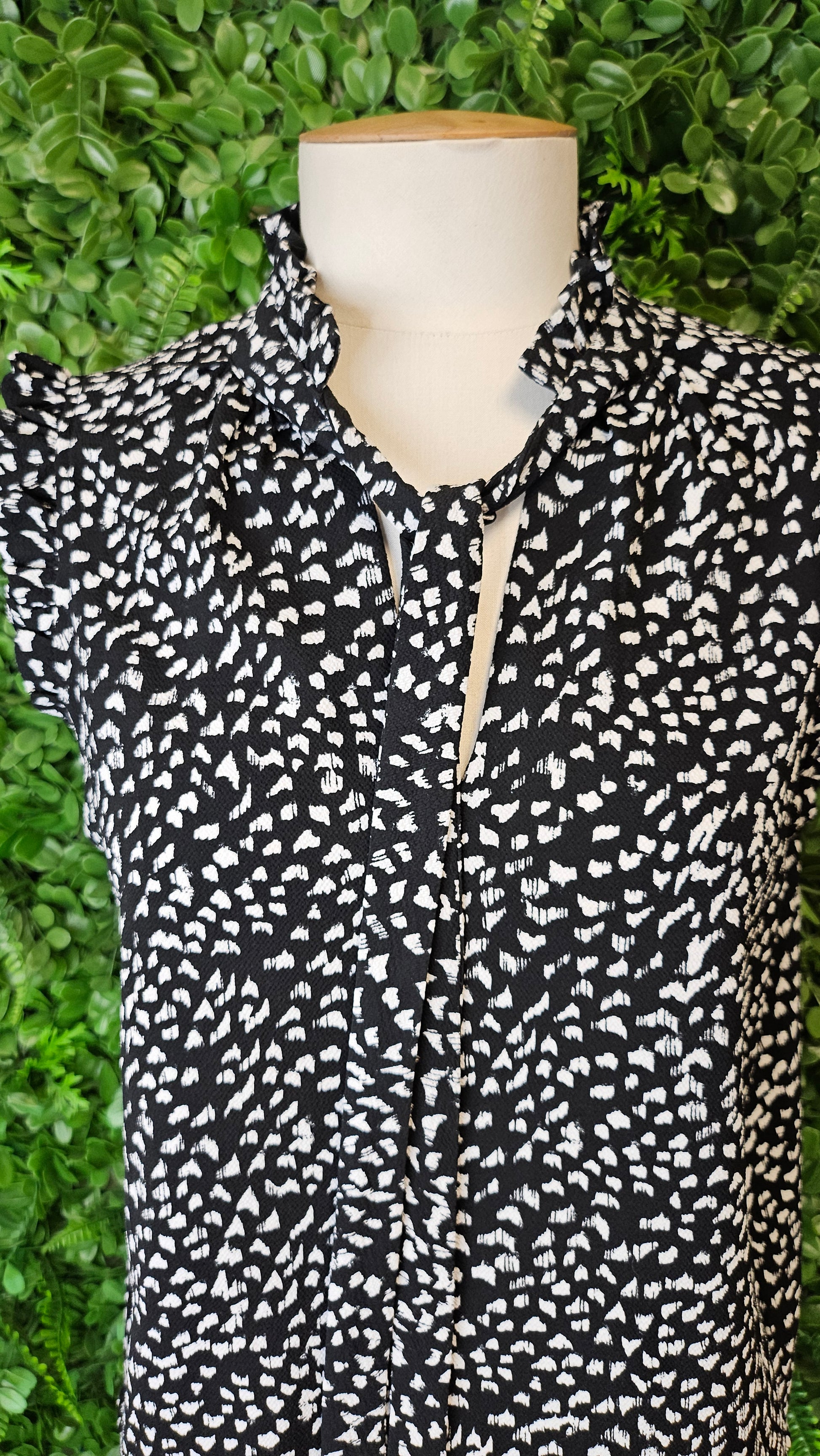 Black with white print top, ruffle and tie neckline and small ruffle around sleeve
