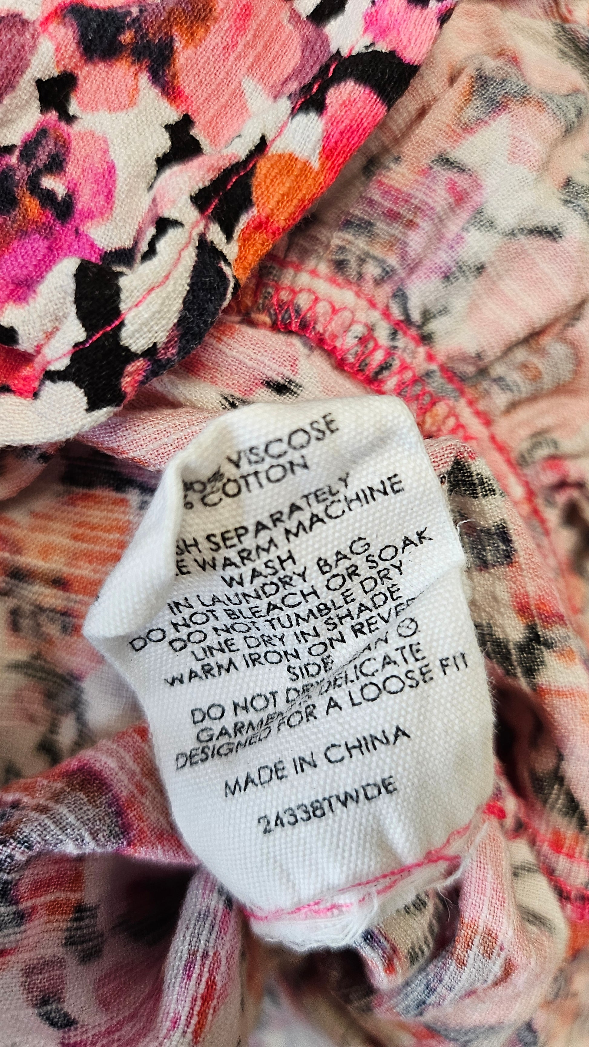 Pink based florall top with frill sleeve and hemline. Hi lo