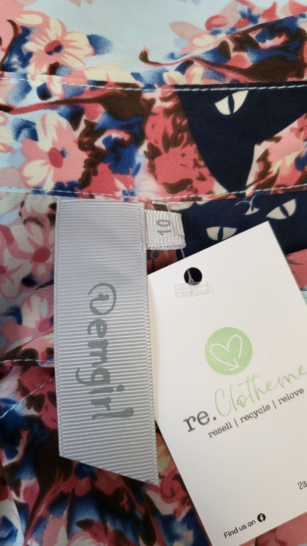 Flowers and cat print shirt with a high/low curved hemline.