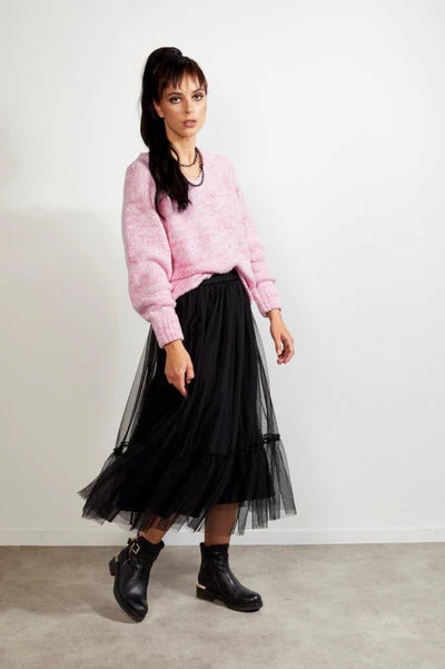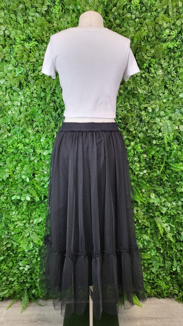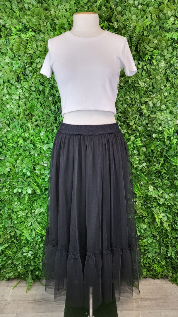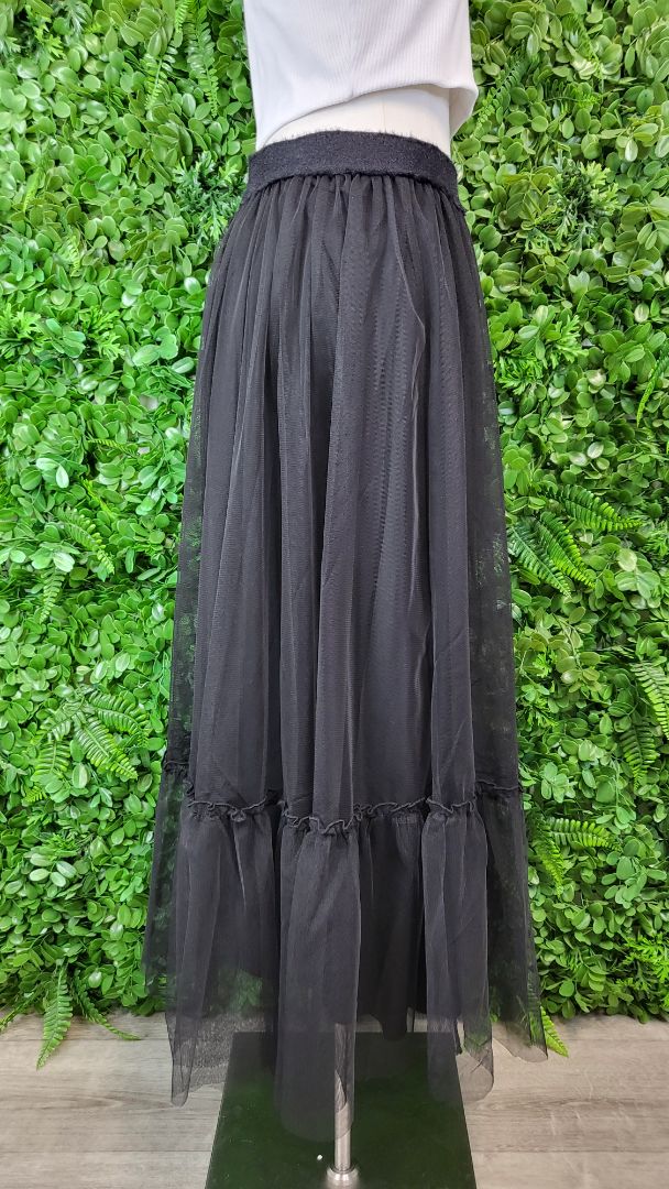 Drama's Manor skirt has an elastic waistband the tulle is sitting over top of a black skirt with a ruffle tier at the bottom.