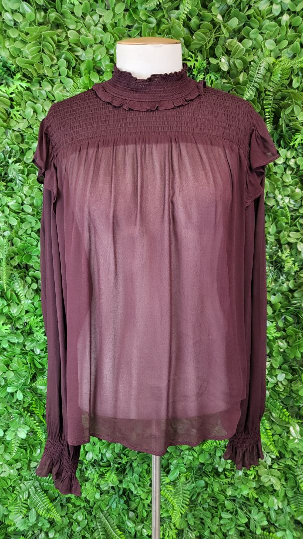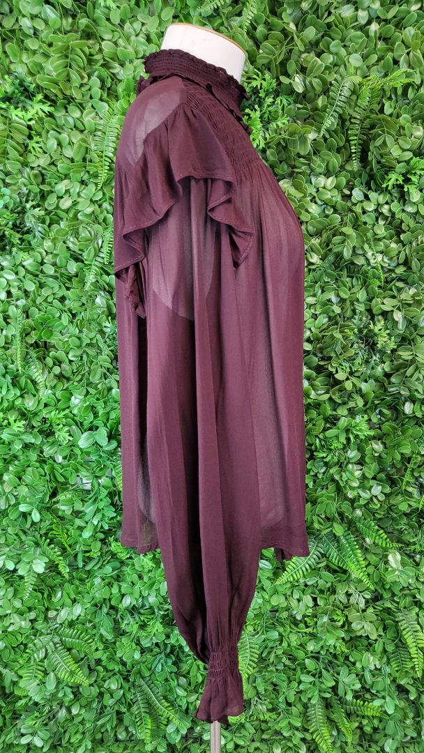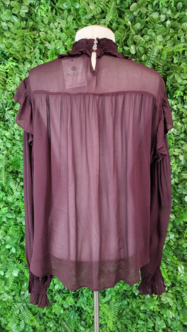Light weight frill blouse with a shirred yoke neckline and cuff with frill.