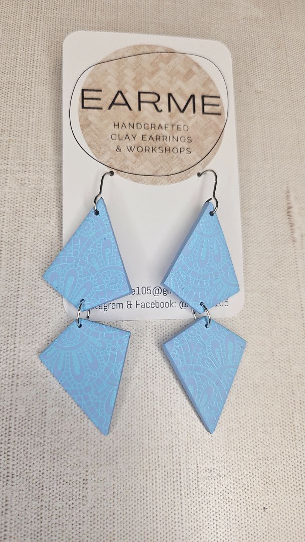 Pale blue drop earring in a geometric angular triangle shape with textured floral print.
