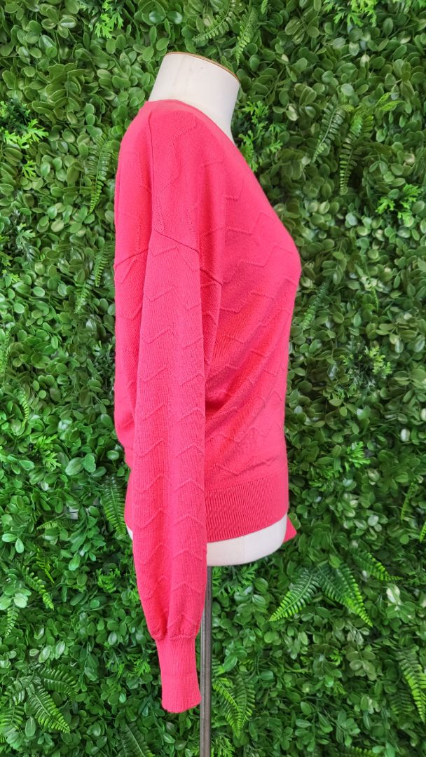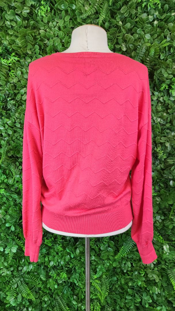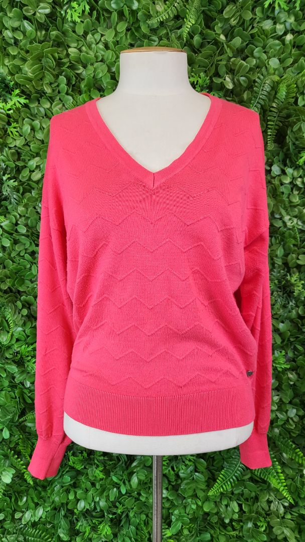 Soft stretch knit jumper, v-neckline with zig zag pattern.