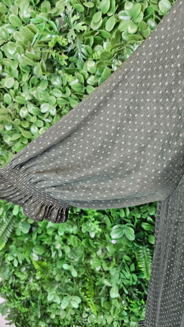 Drop waist dress in olive green with fleck fabric. Tassel tie at neckline and shirring on sleeve.