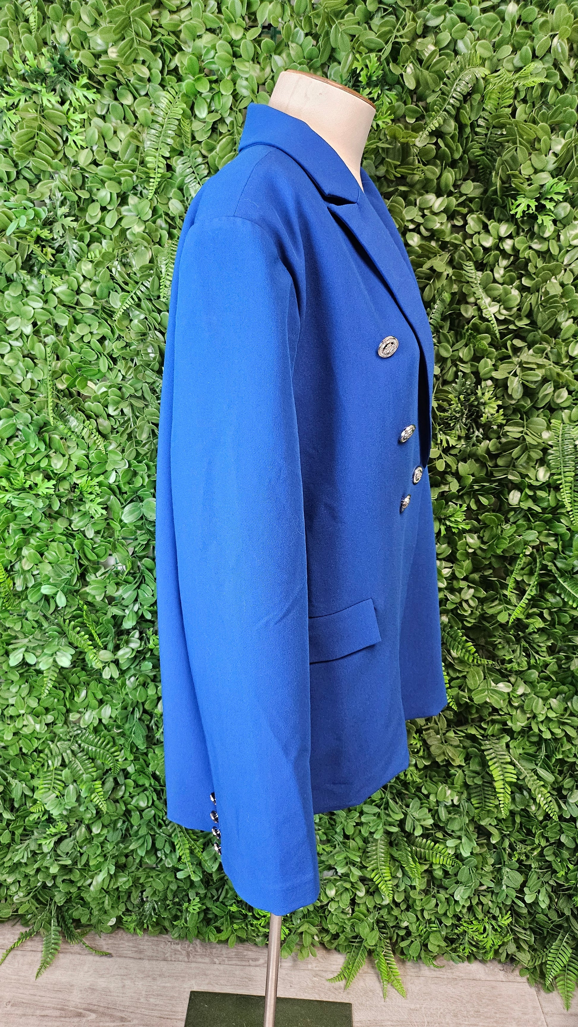 Gorgeous blue blazer with double breasted buttons and silver embossed hardware. Pockets. Lined
