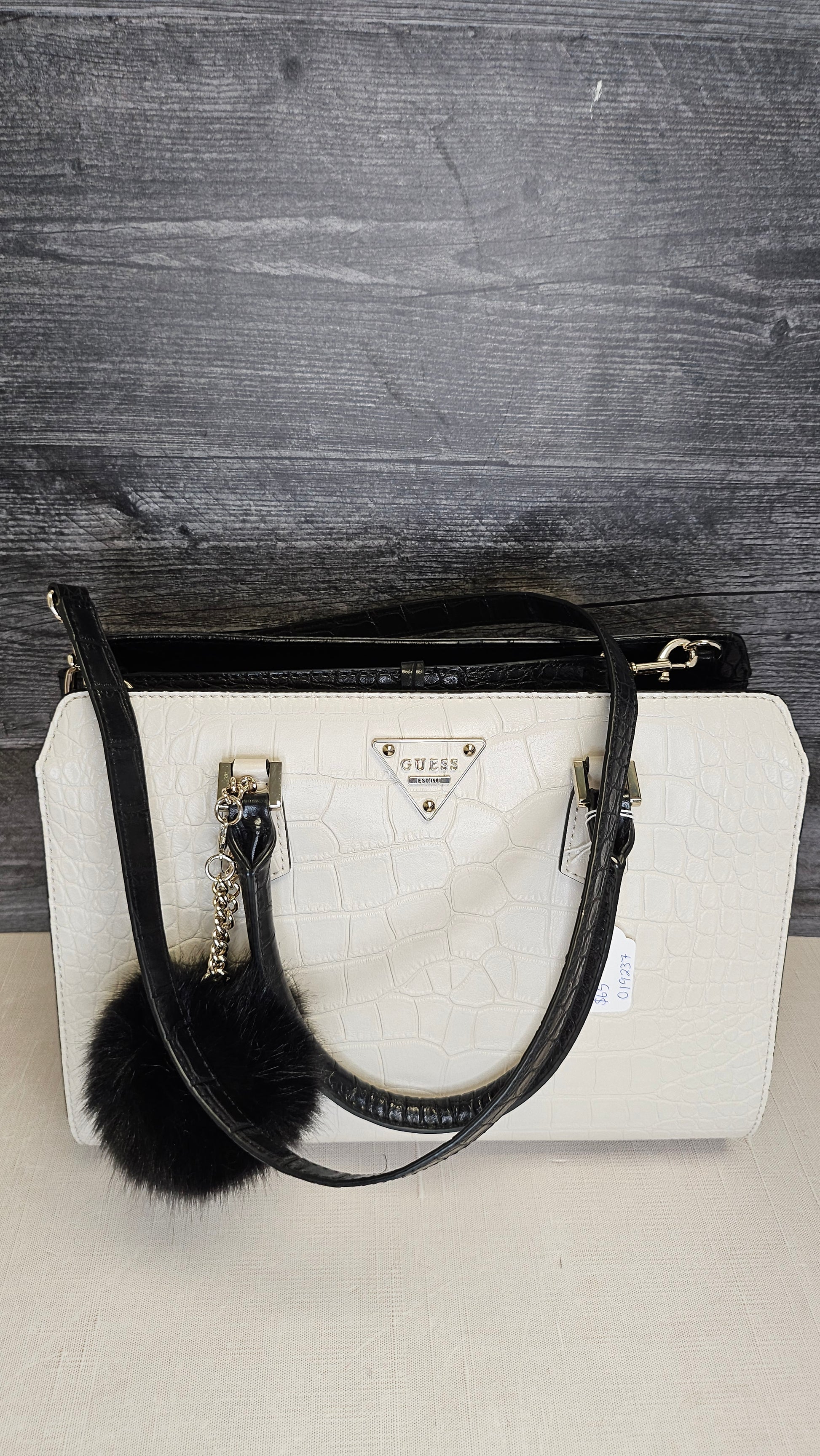 Pleather guess bag with fluffy pom pom in a textured croc print and contrasting tones.