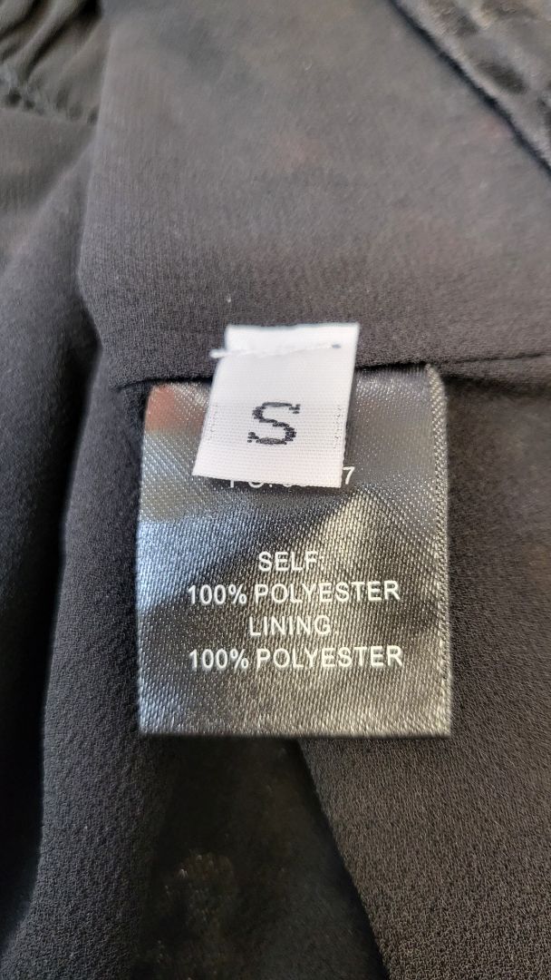 Black based dress with floral print and border detail. Wide shirred waistband and elastic at cuff. Lined thru the body.