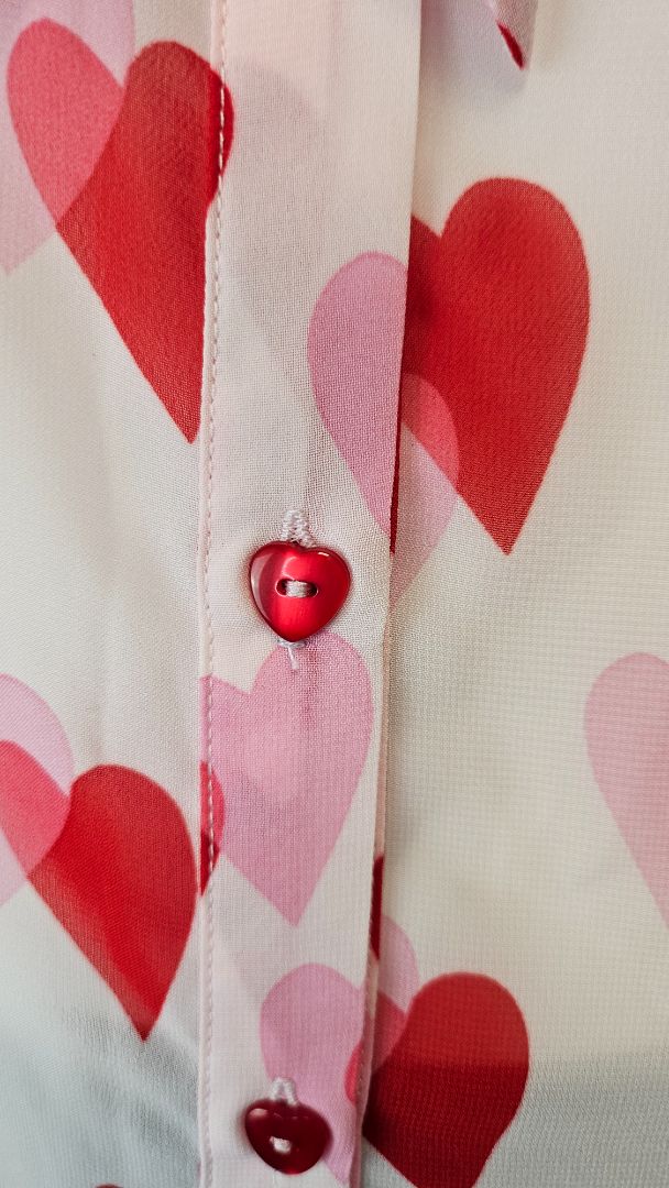 Chiffon blouse with red and pink heart, pussy cat bow at neck and red heart buttons. Puff sleeve. NEW