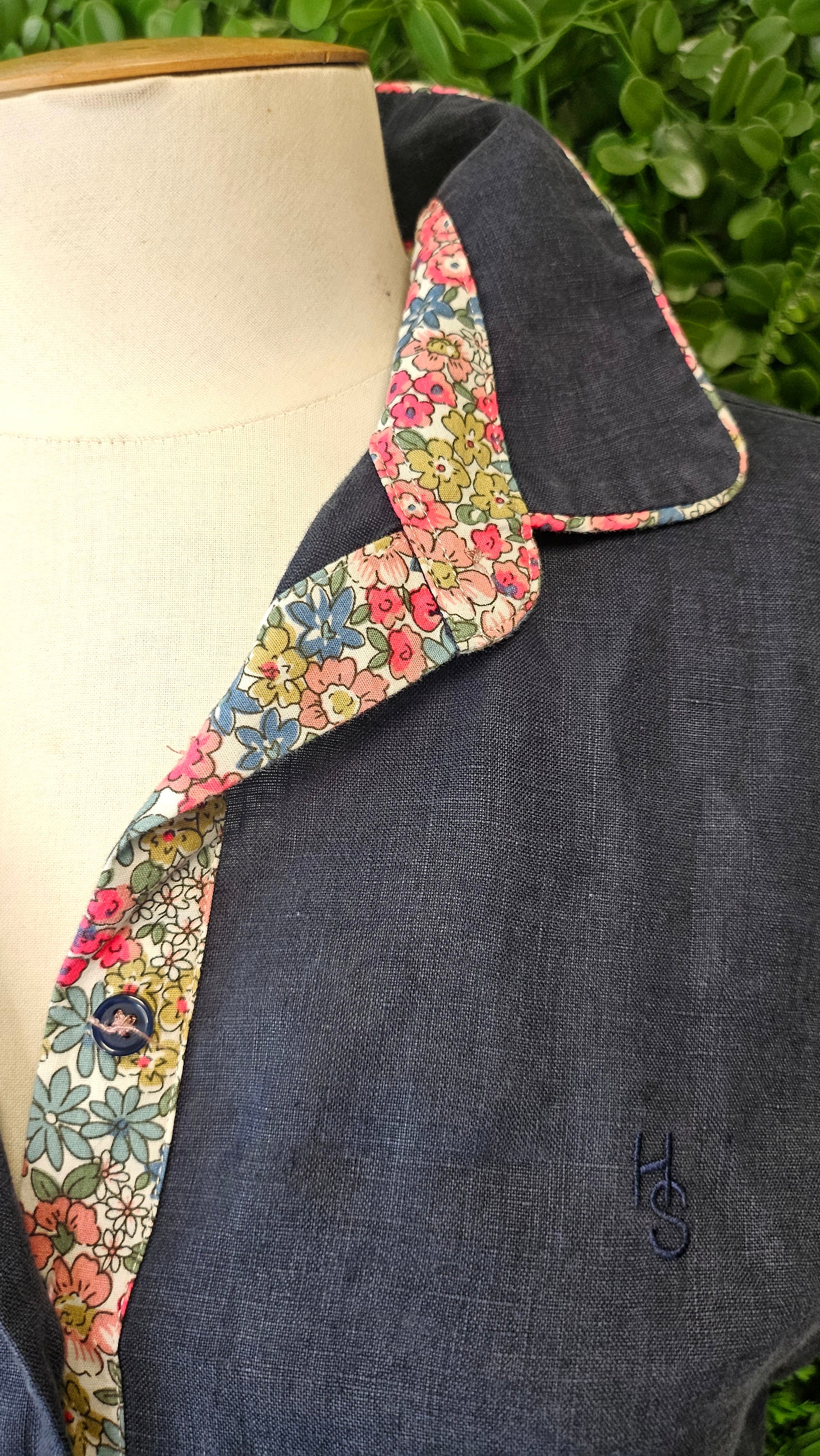 Linen dress with collar with floral trim button to midway, cap sleeves and a curved hemline.