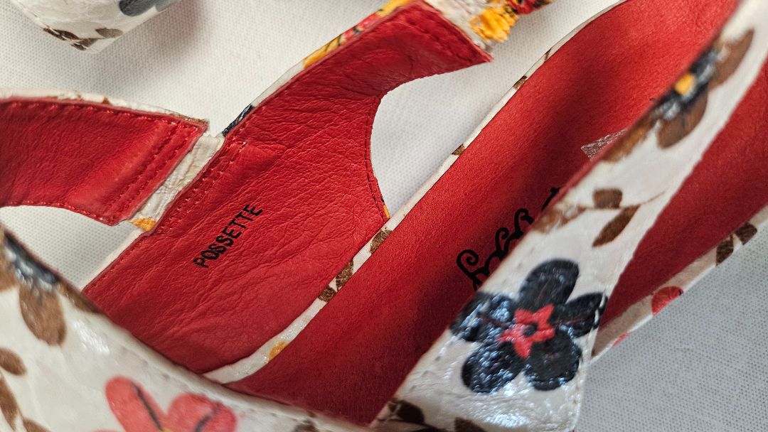 These little cuties are brand new and come with replacement heel stoppers. Peep toe, squatty heel and velcro closure with red button.
