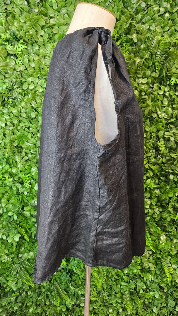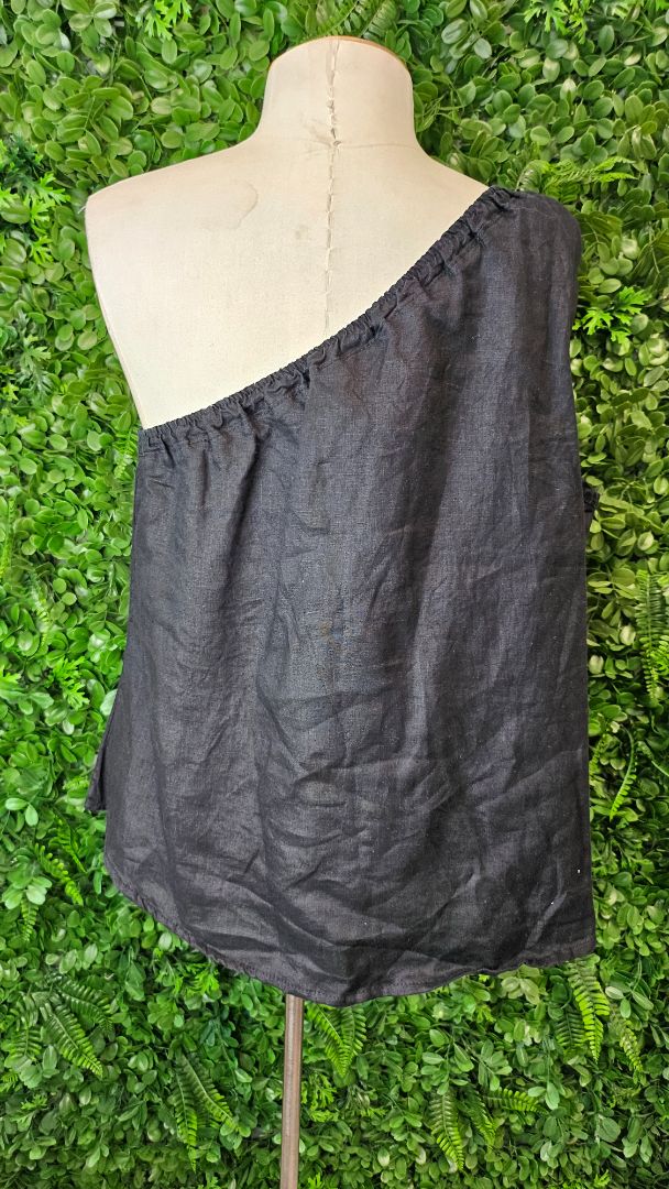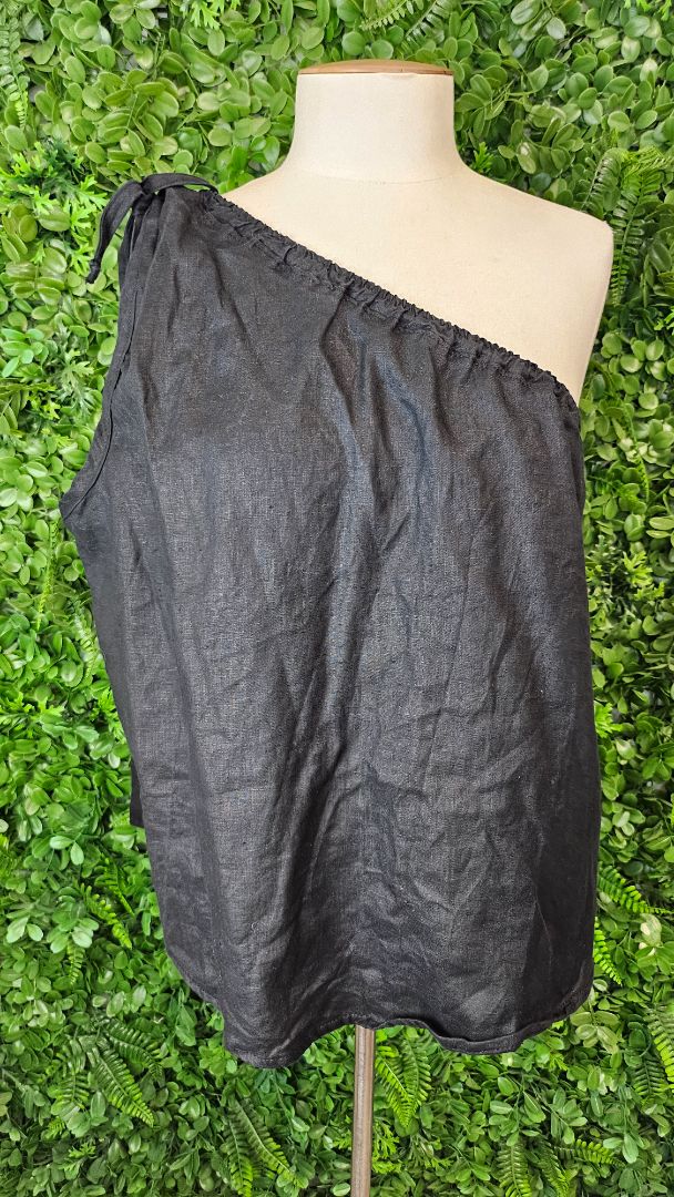Soft linen one shoulder top with amd elasticated neckline and ribbon detail on strap.
