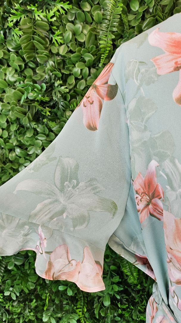 Floaty georgette dress in a pretty mint green with lily floral print. Lined thru the body. Self fabric belt. Flute hemline and sleeve. Pinch pleat detail thru bodice. Dips slightly longer at the back. New.