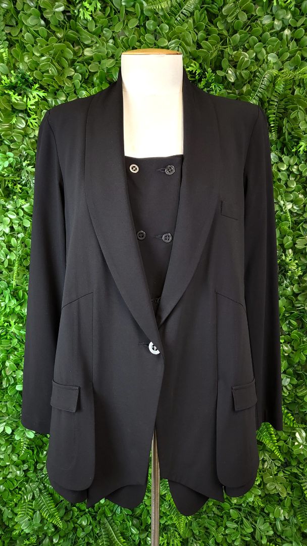 Fitted stretch blazer with built in vest, beautifully tailored with hemline splits on the front and back, doubled breasted vest with blazer overlay with 1 button closure.