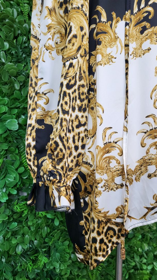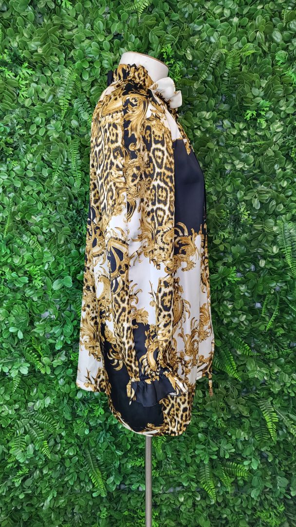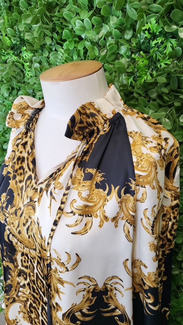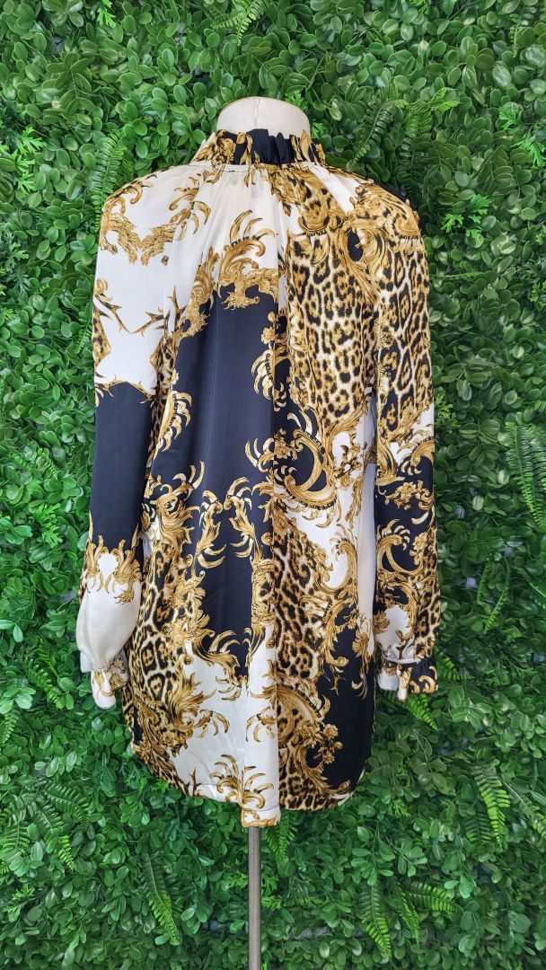 Animal and floral print with ruffled neckline with v-neckline and tie, 3/4 sleeves and elasticated cuffs.