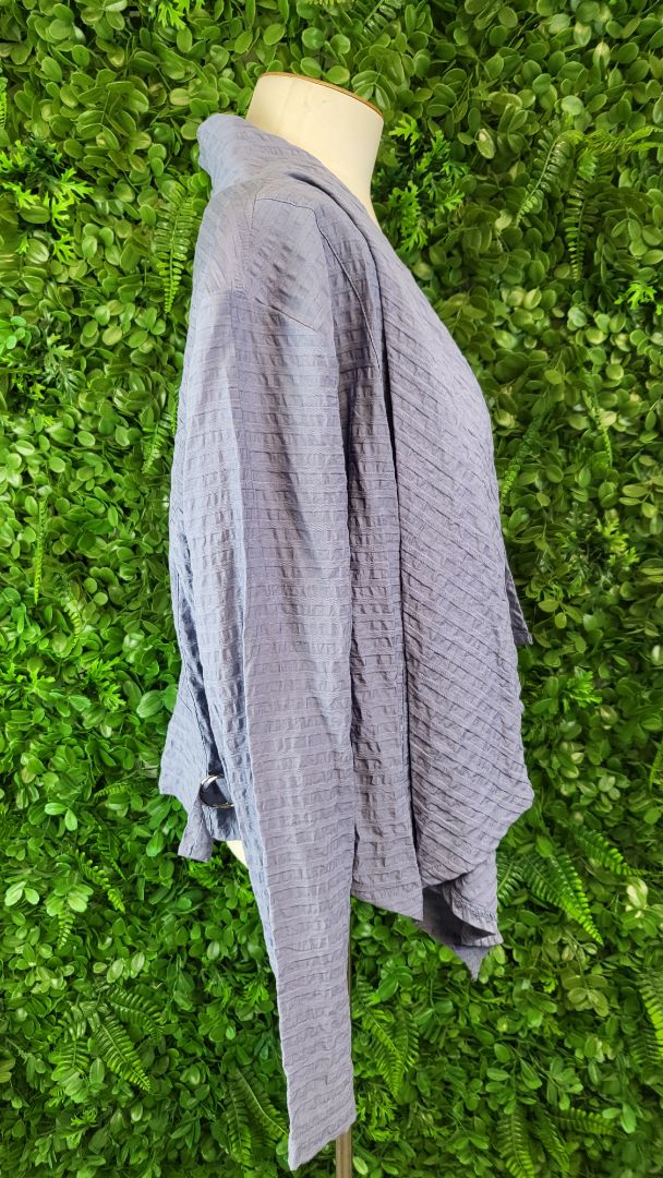 Textured light weight jacket with a waterfall lapel in a cropped fit.
