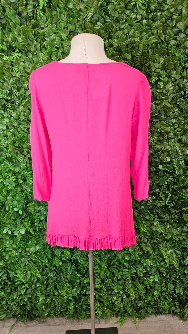 3/4 sleeve top with v neckline and frill hemline