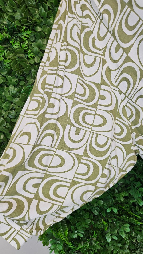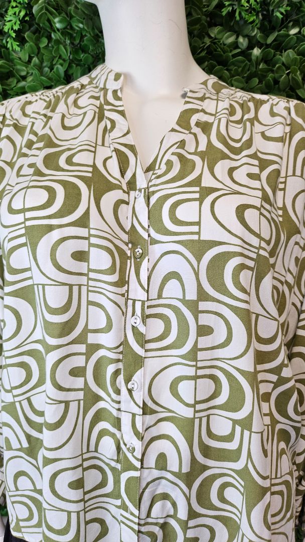 Green and white print blouse with buttons down the front and voluminous batwing sleeve. Oversized fit.
