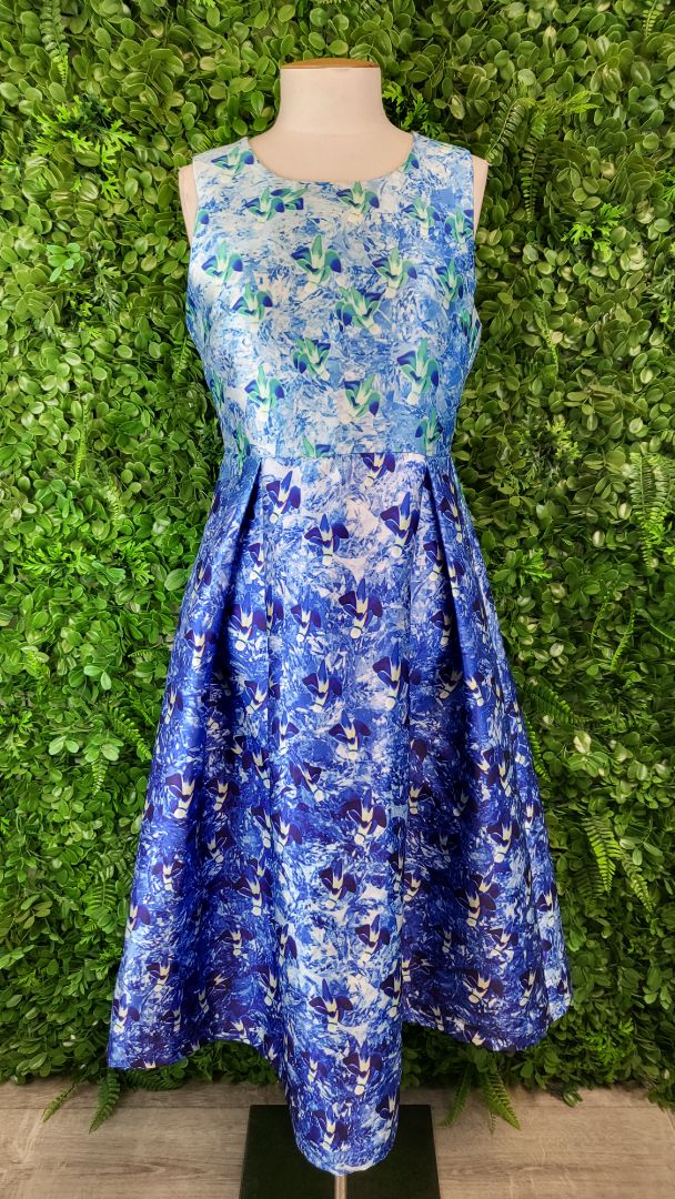 Fit and flare dress with a high neckline and pleated folds at the front.