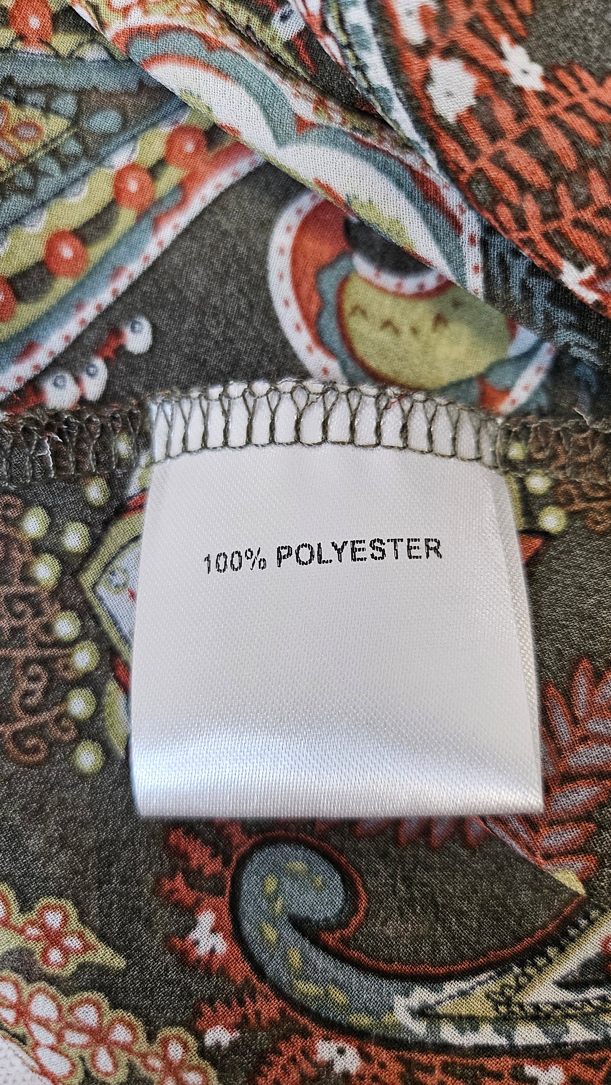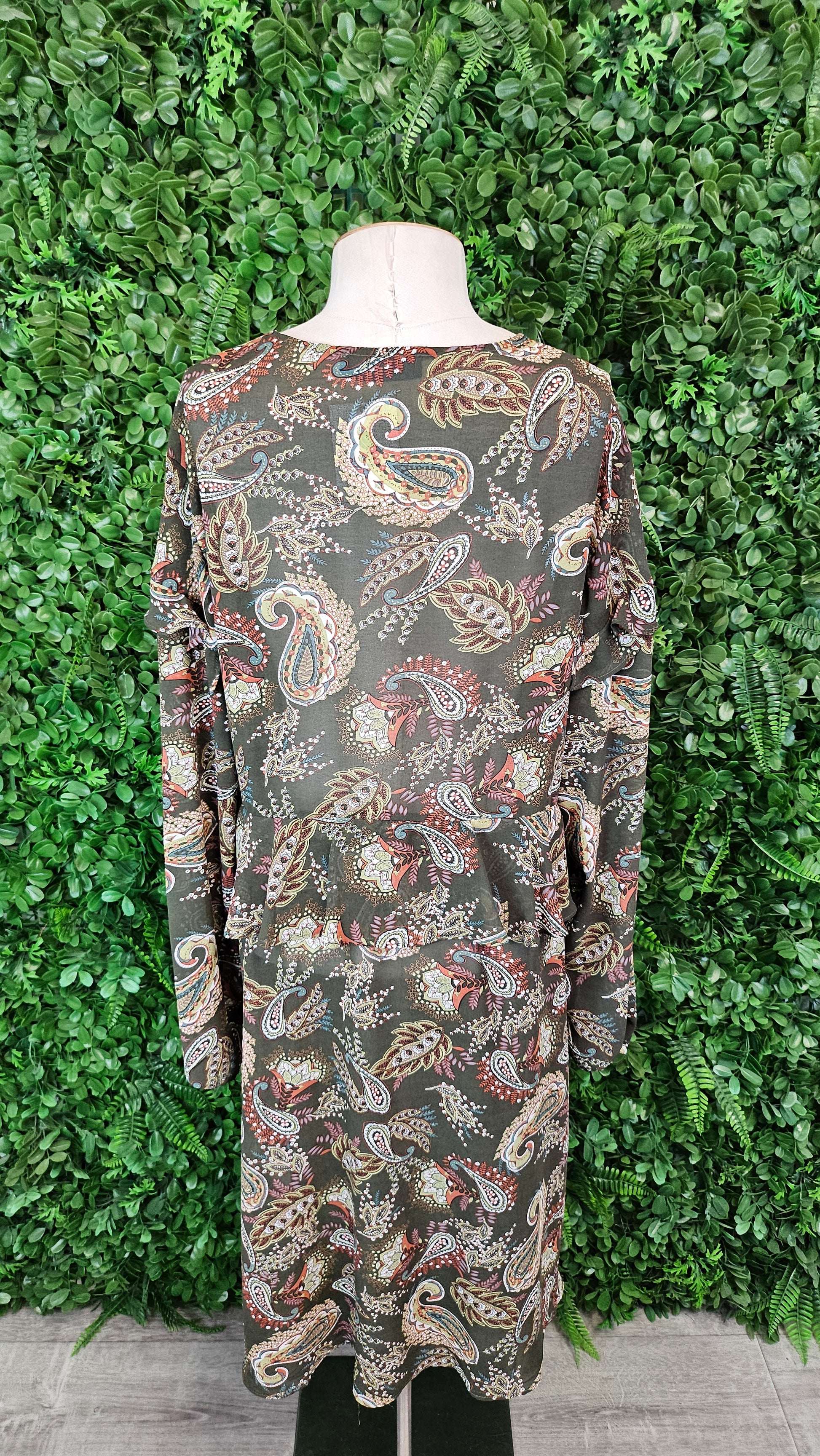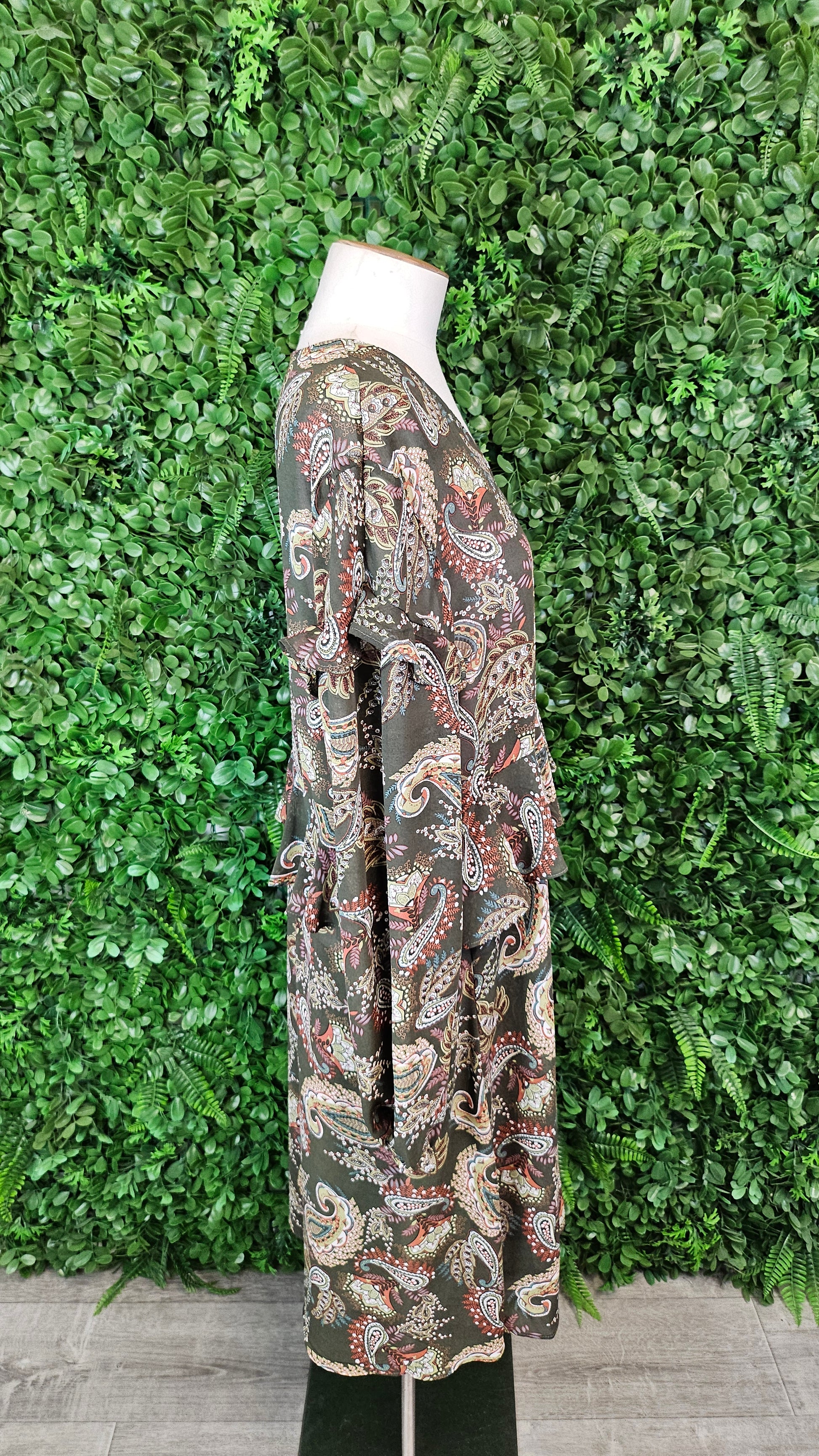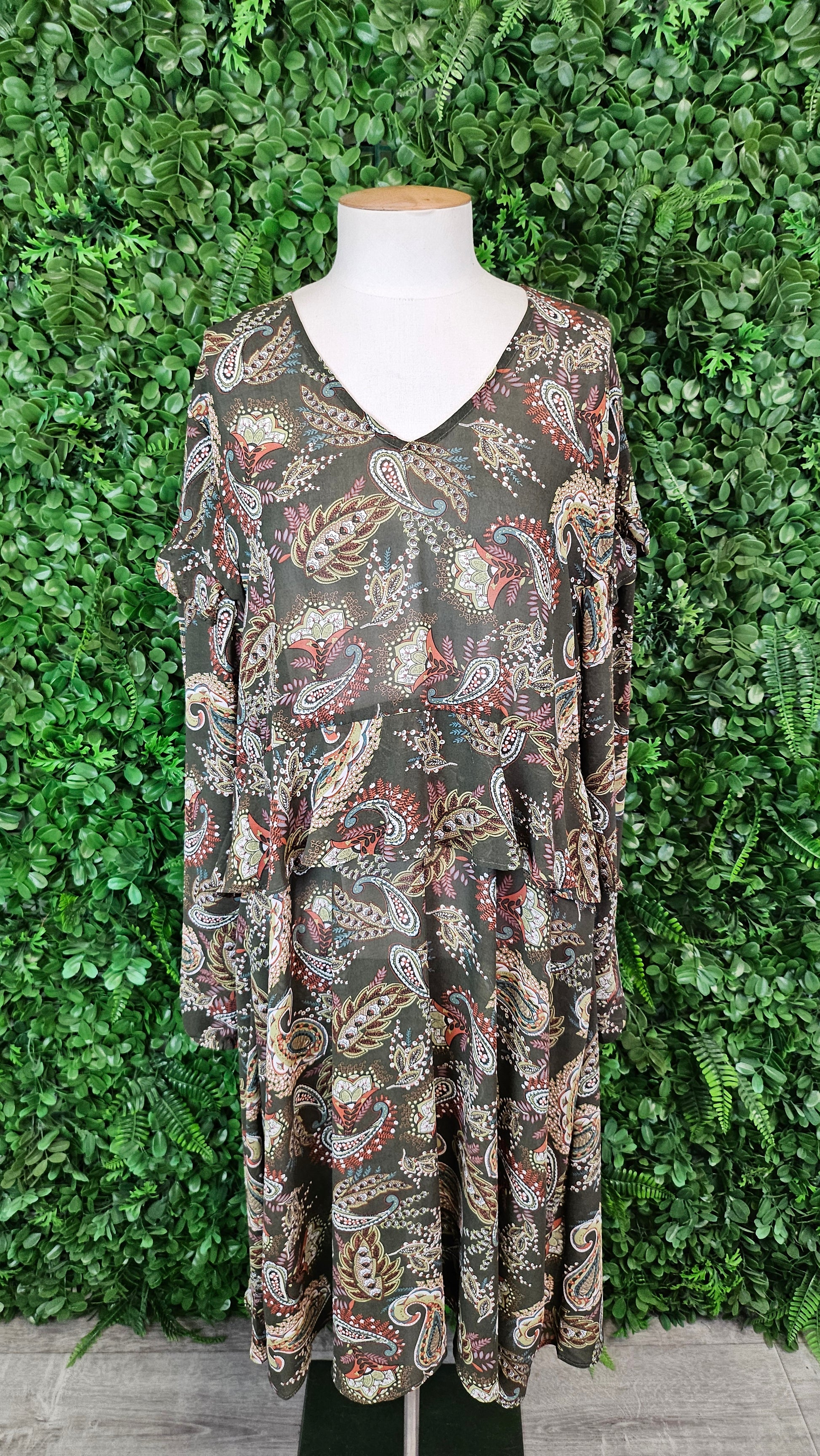 Paisley print dress with midway frill, elasticated sleeve cuffs.