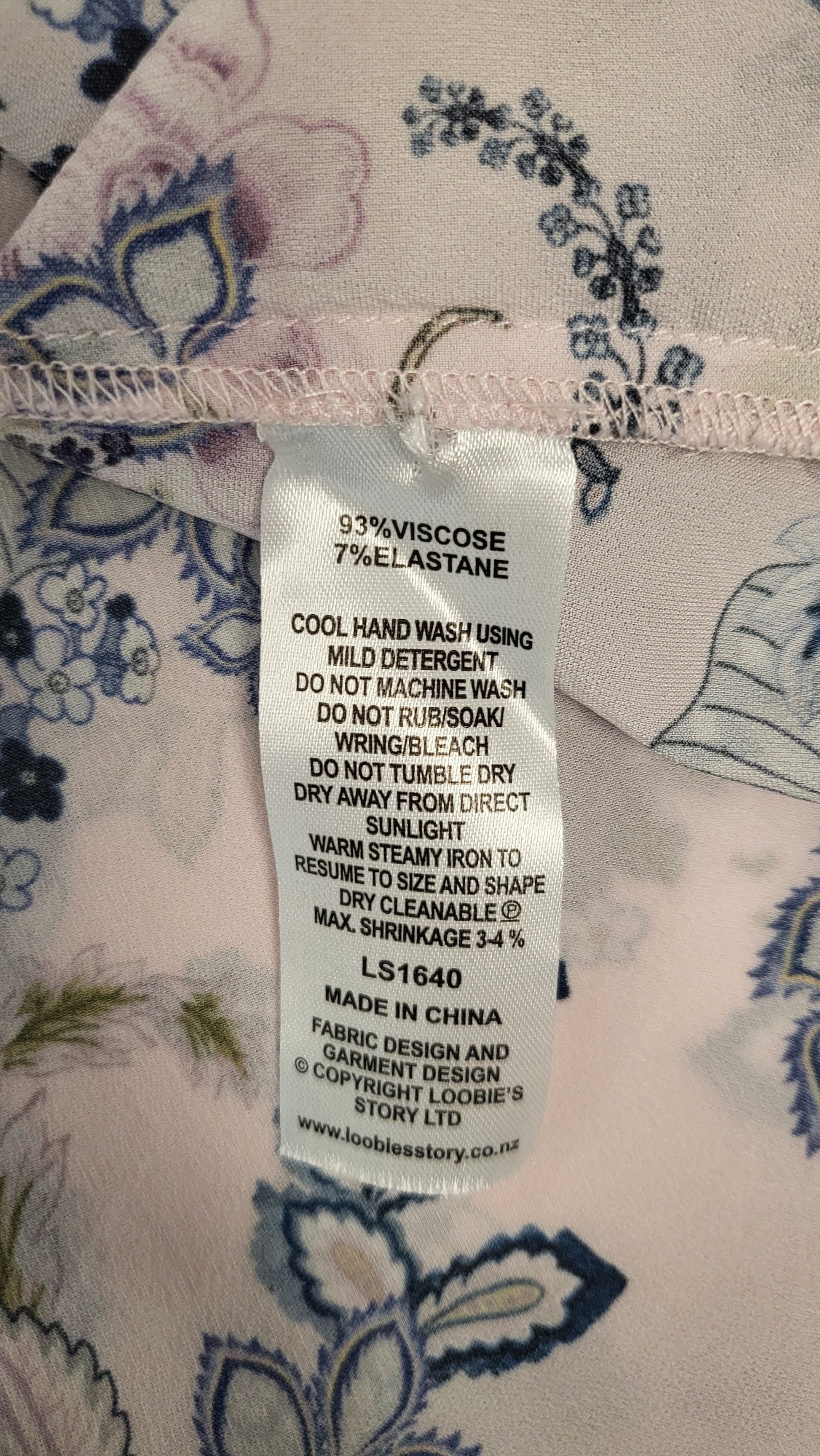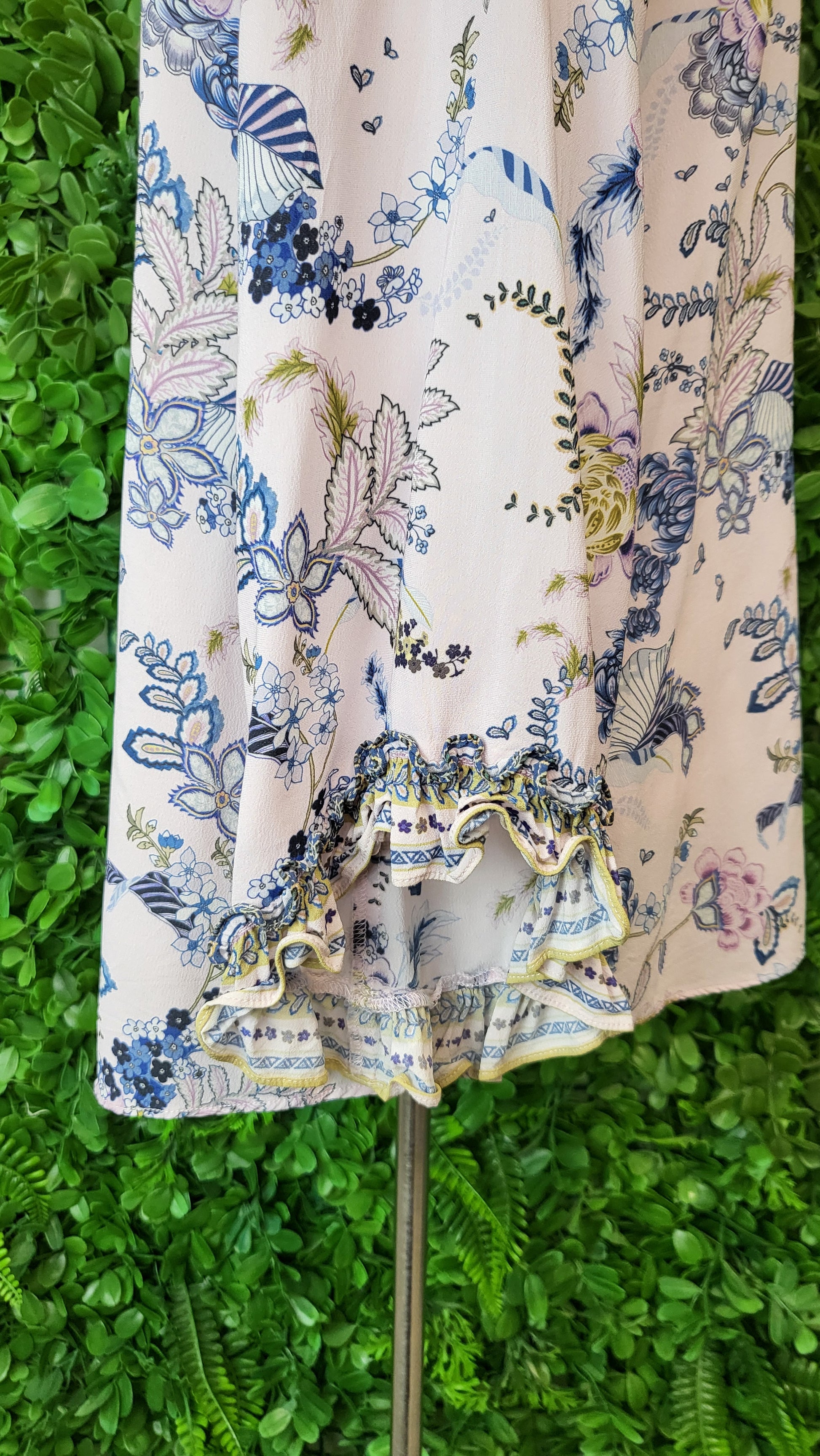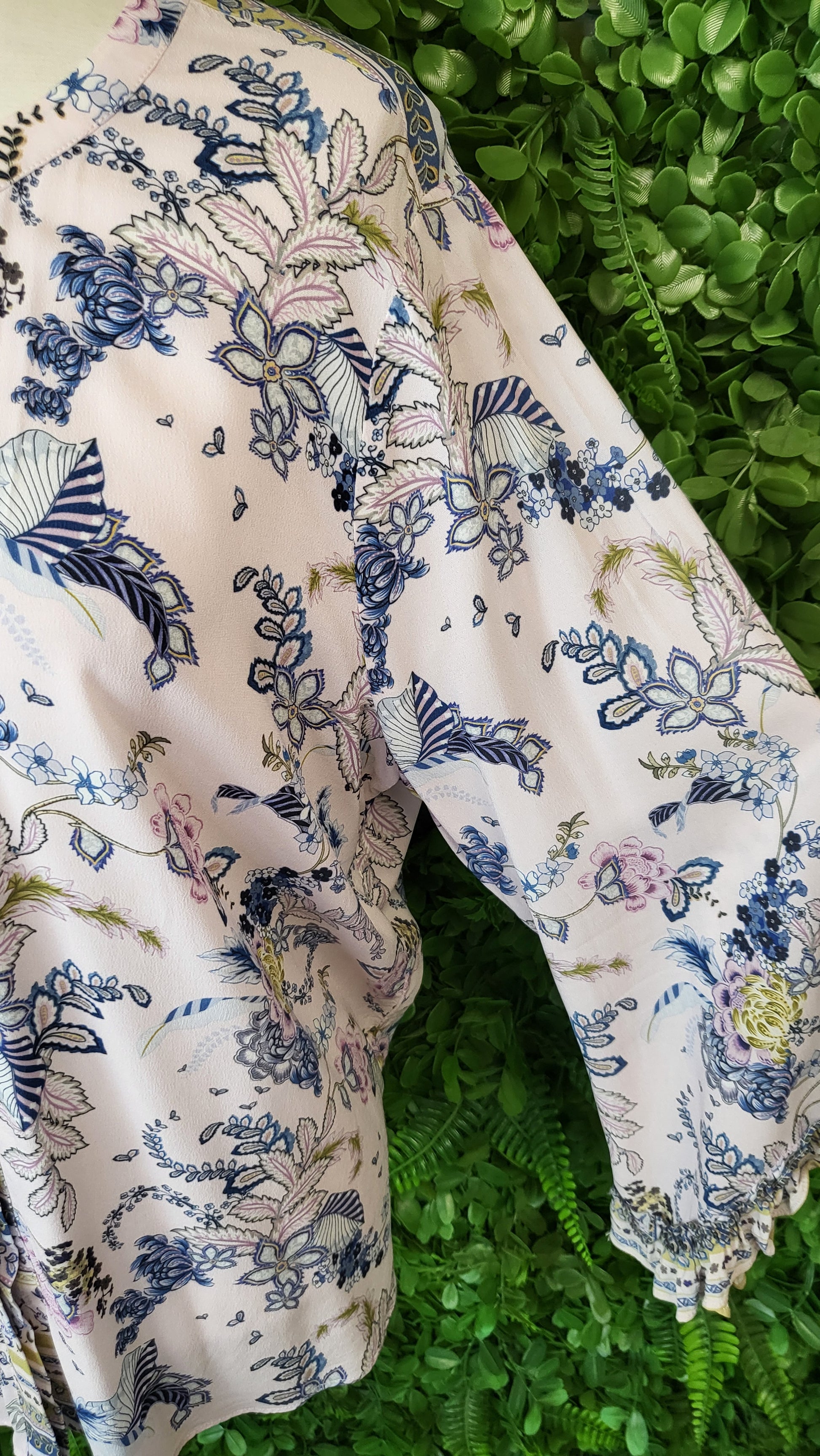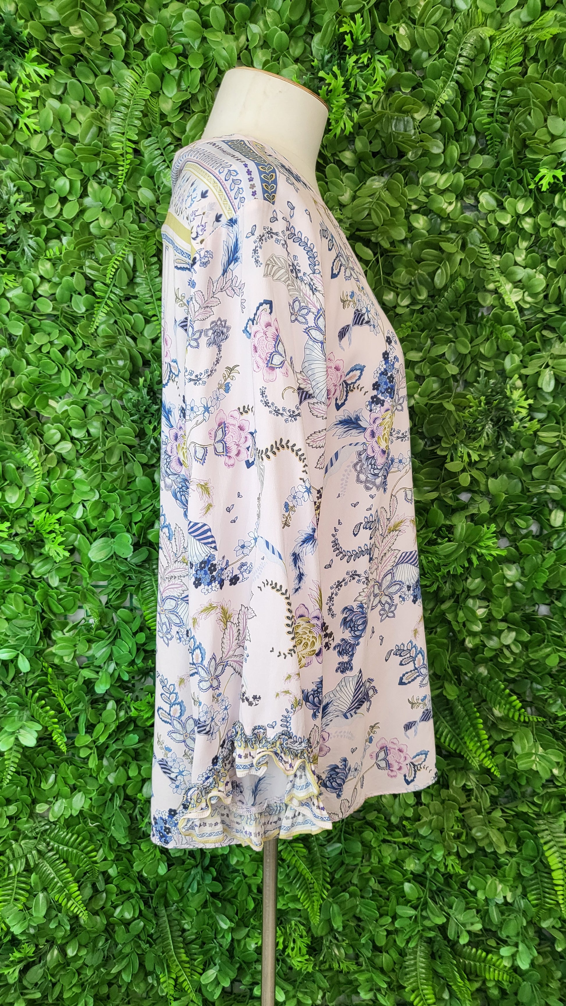 Viscose blend blouse with button down front, 3/4 sleeves with a flared cuff with lovely ruffle edging.