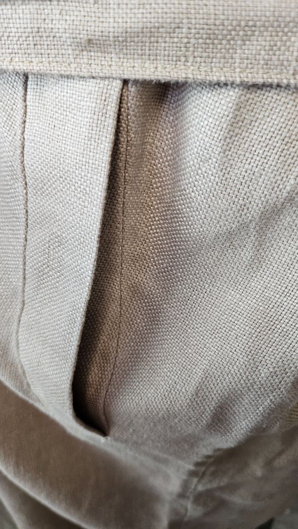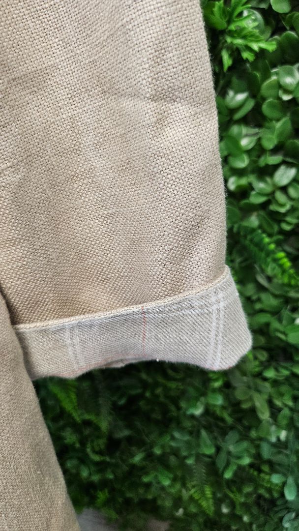 Heavy weight linen jacket woth waist tie and button down front closure and side pockets.