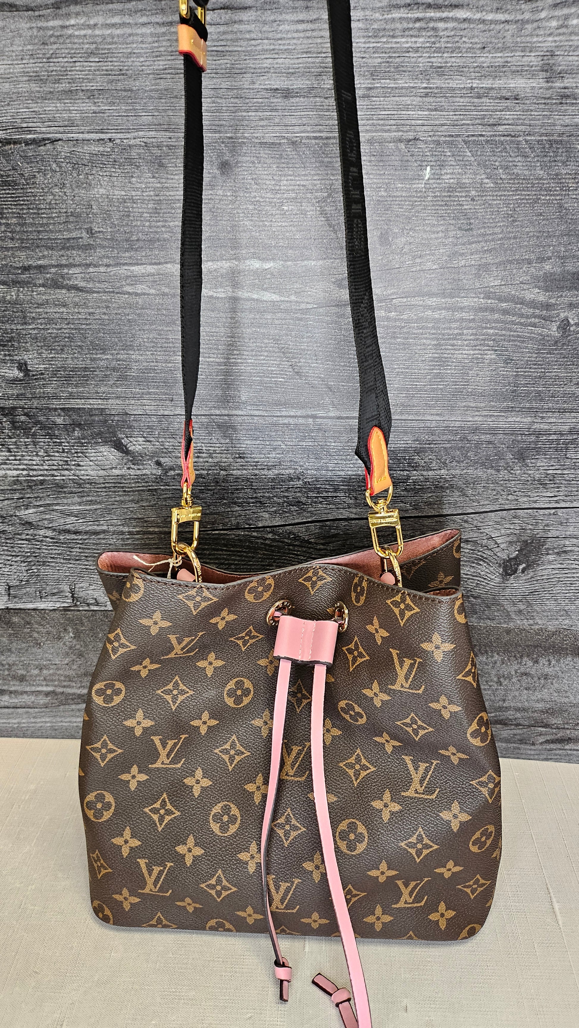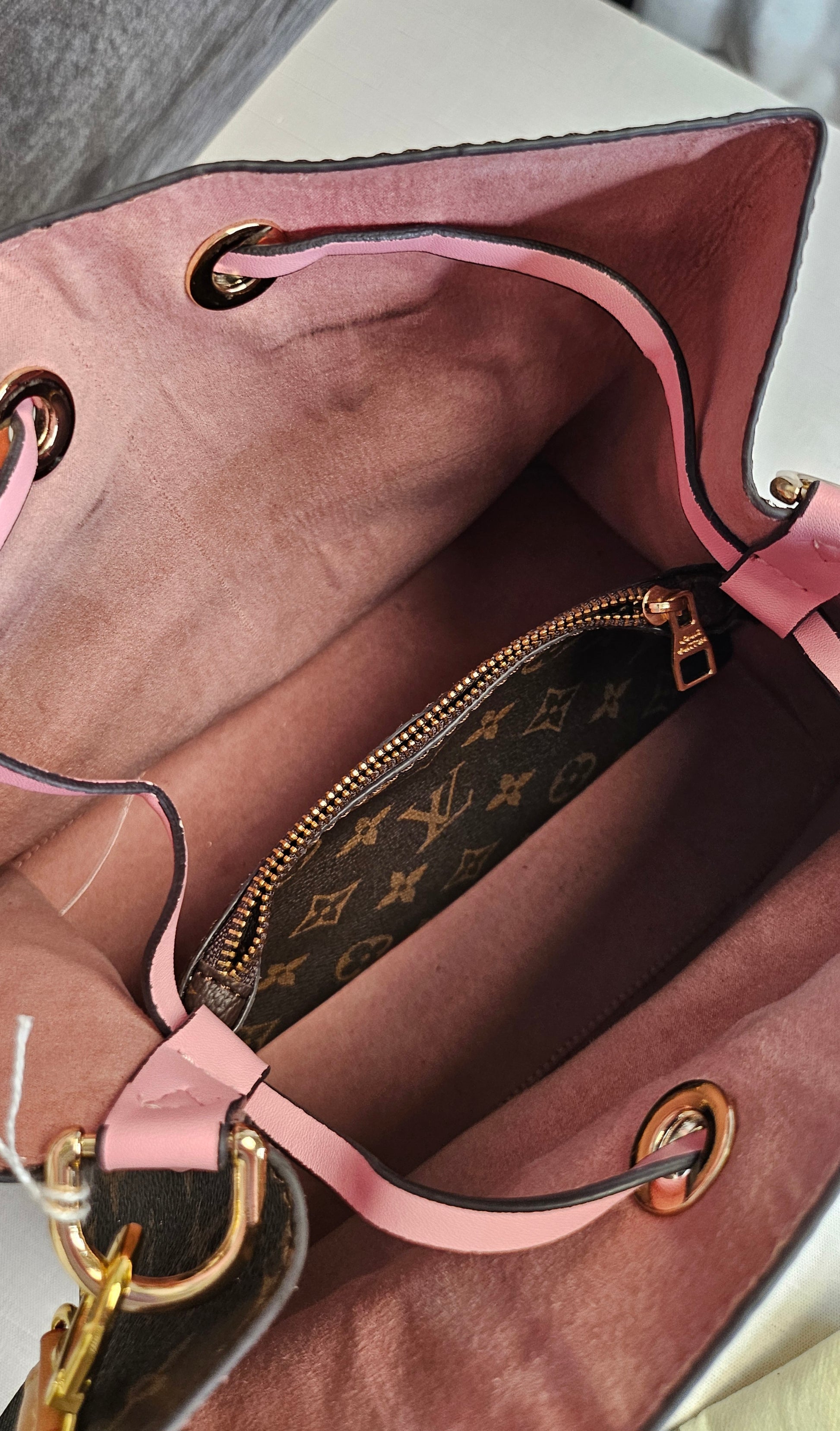 Copy Louis Vuitton tote with pink pull cord closure, webbed branded strap, internal zipped purse and compartments