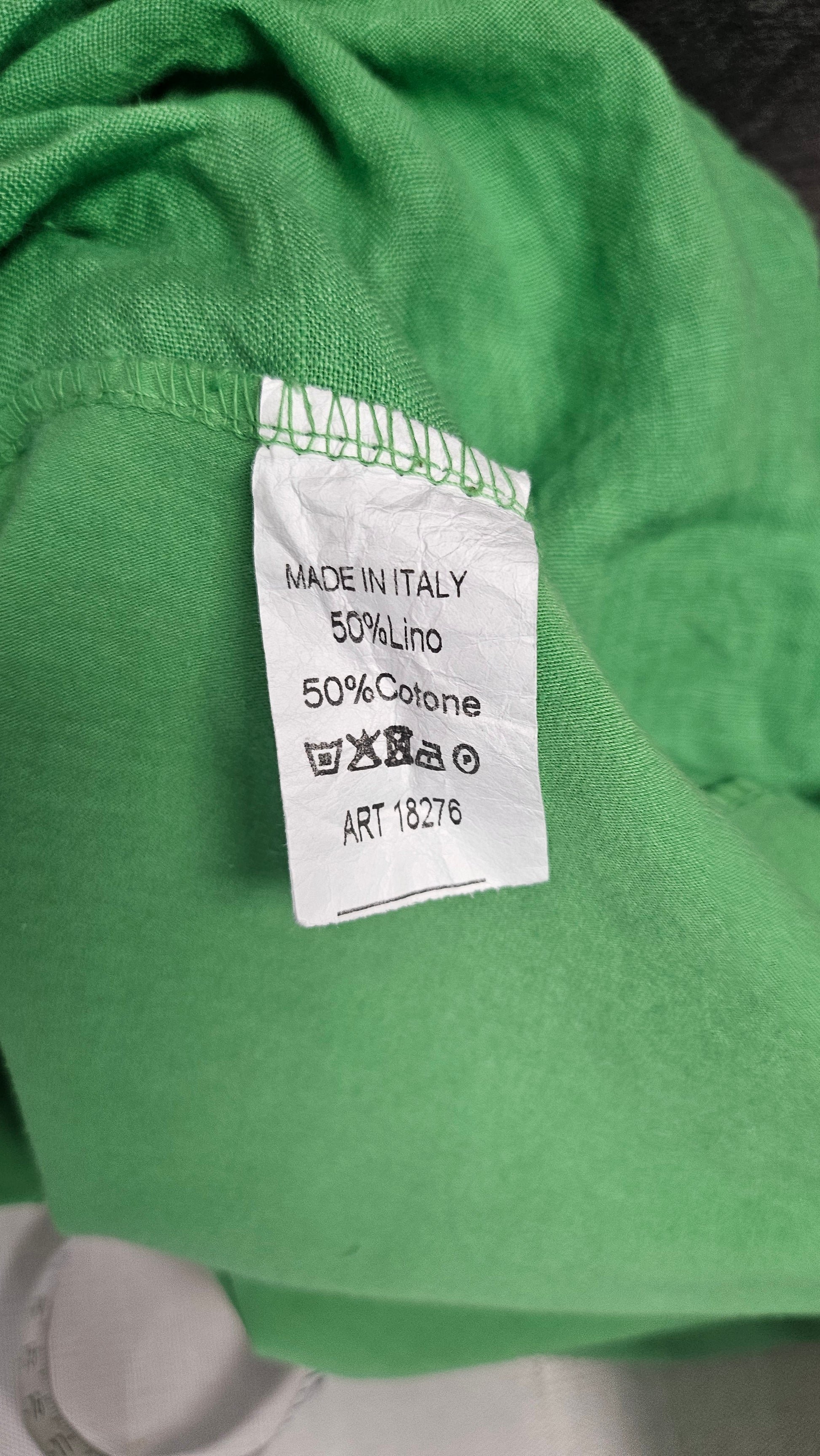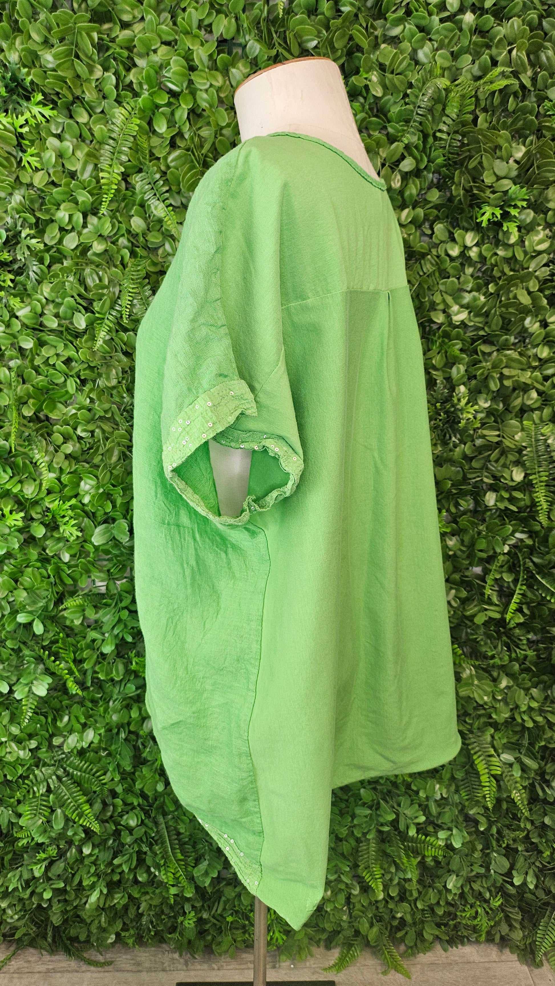 Relaxed style linen blend top with sequin trim around hem and cuff