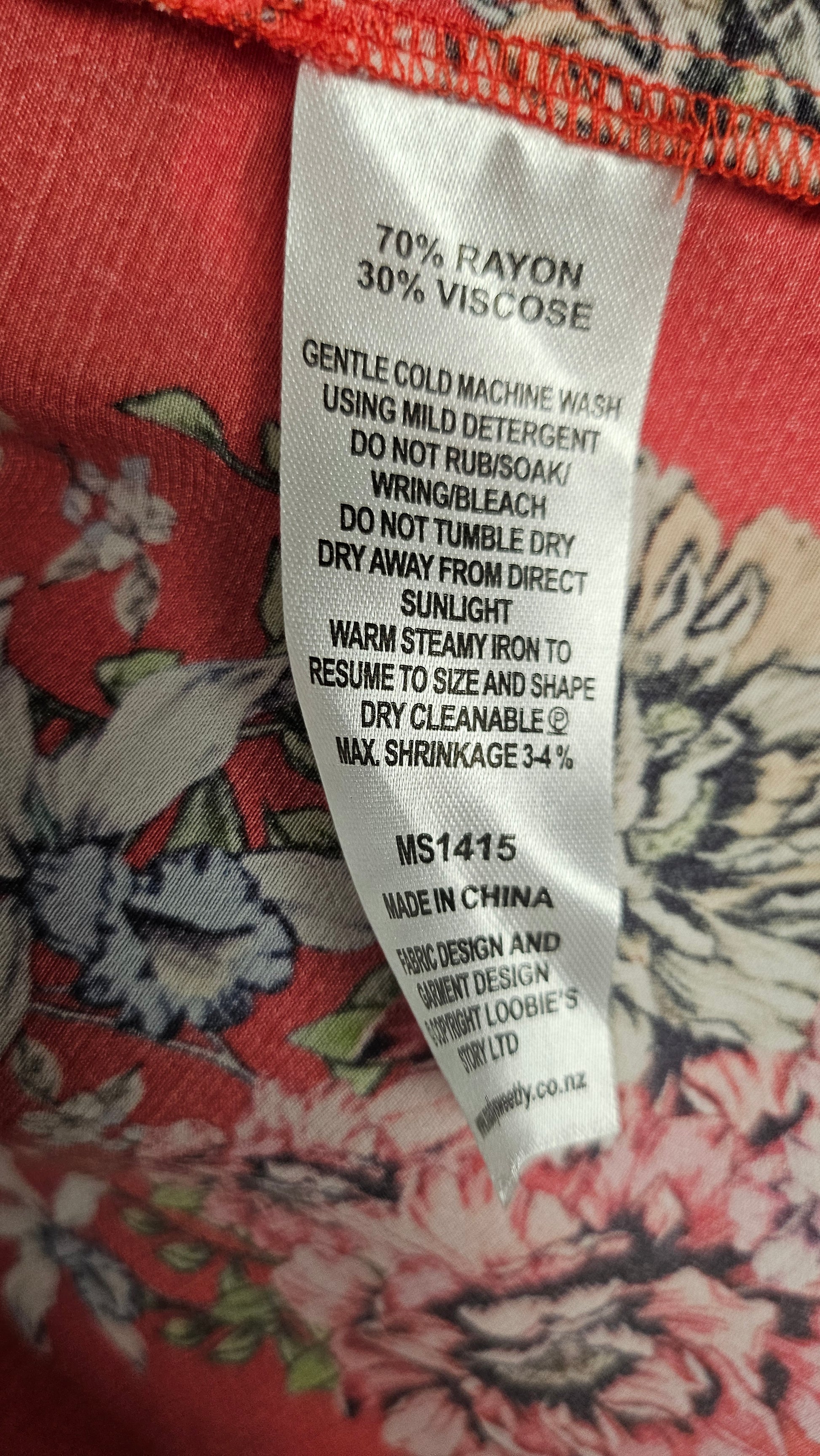 Lovely rayon floral top with v-neckline with front pleat detail and fluted sleeves.