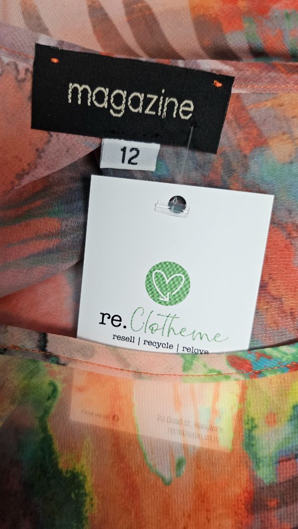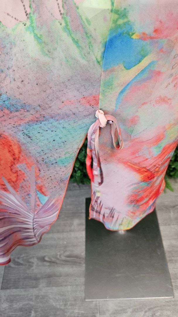 Light weight print tunic with asymmetrical hemline with tie detail.