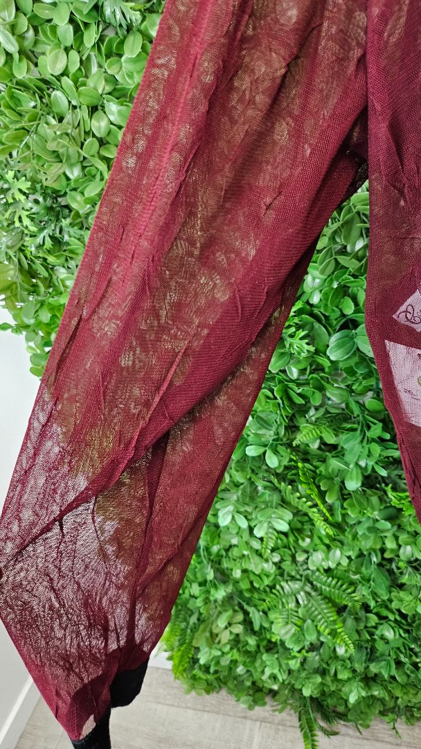 Lovely layering mesh top with satin trim around cuff, neck and hemline