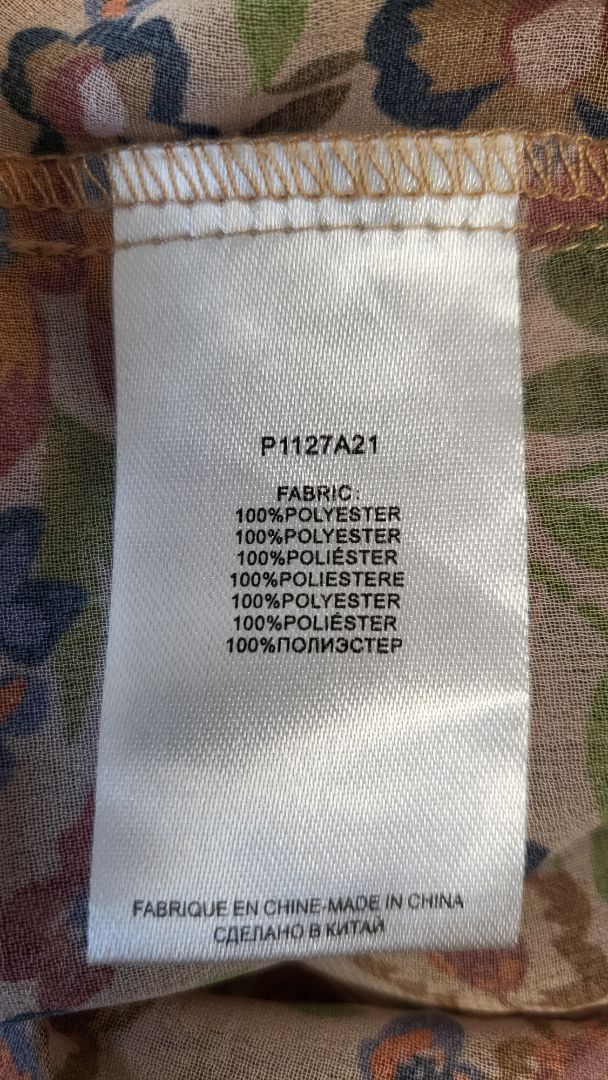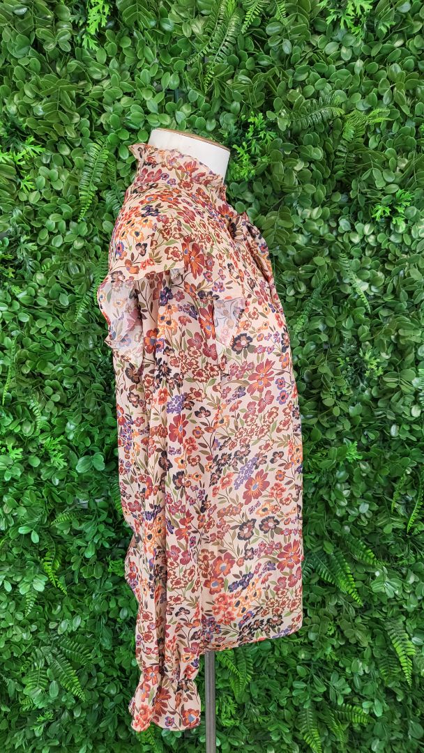 Floral blouse with frill neckline with tie, frill at shoulder and elastic frill cuff