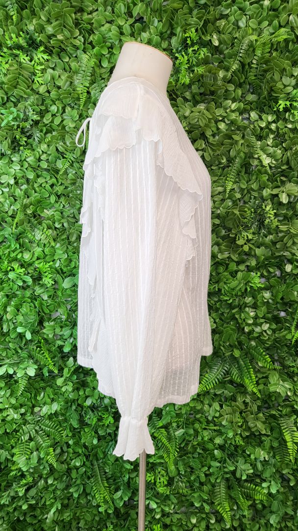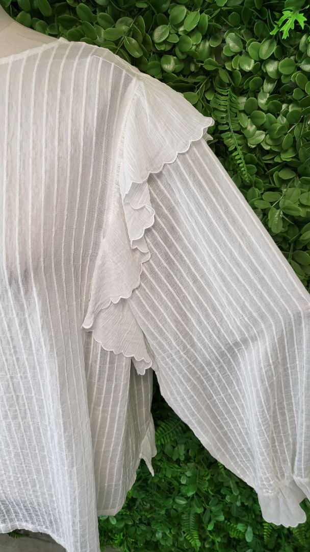 Romantic and feminine cream blouse by moochi, ruffles detail along the front and sleeves, keyhole neckline with tie, elasticated cuffs with frill cuff.