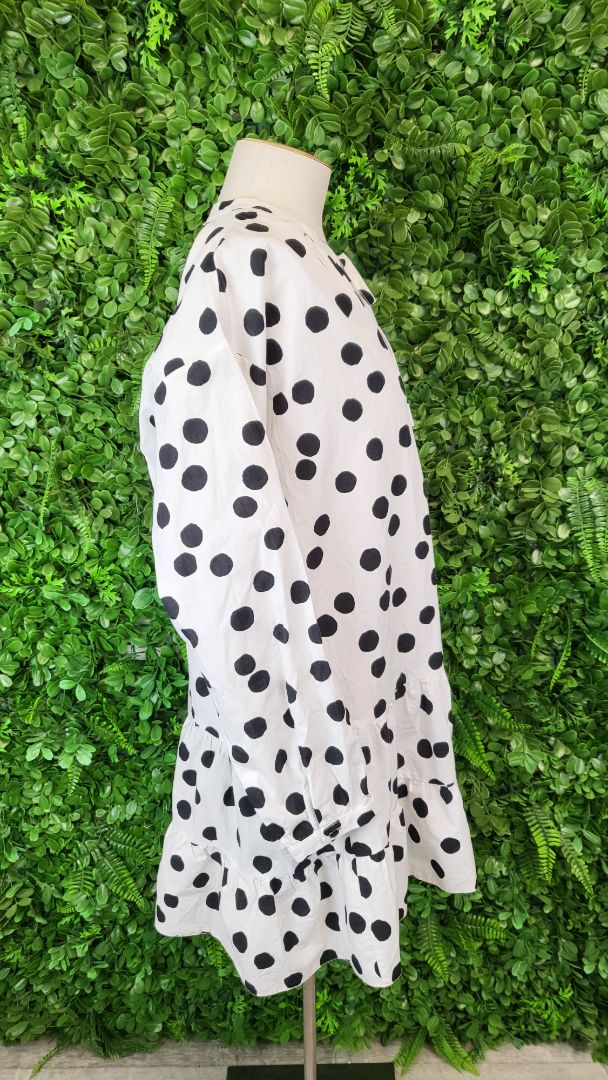 Crisp cotton top with tie neckline, button cuffs, high/low hemline with tiered hemline.