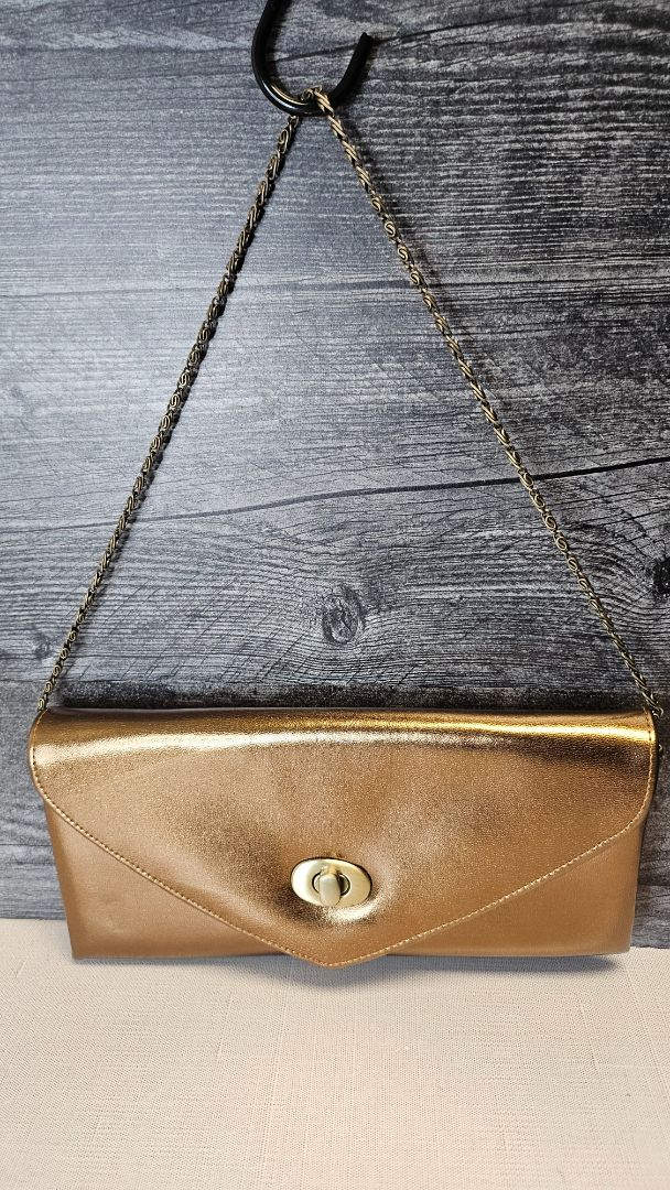 Envelope clutch with brushed gold hardware. Optional chain strap.