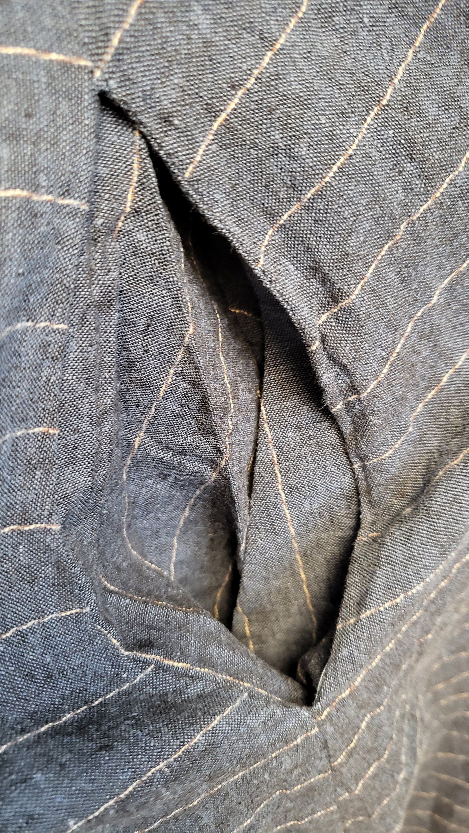 A-line shirt style dress in denim blue with tan pinstripe. Pockets.