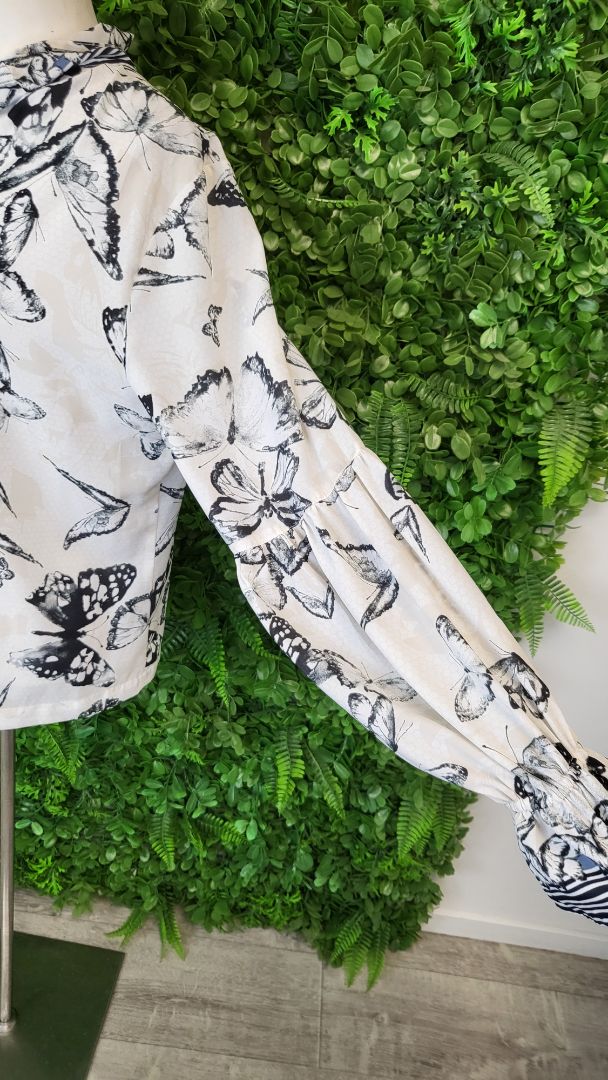 High neckline with tie that ties at the back, full sleeves with balloon fullness starting at elbows to a elasticated ruffle cuff, beautiful butterfly print.